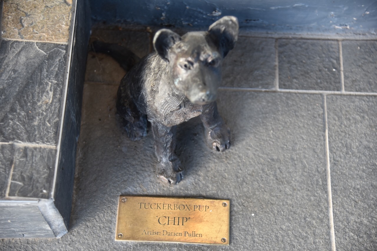 At the hotel, you can find the sculpture of ‘Chip’, the Tuckerbox pup. It is the work of artist Darien Pullen. He is the same artist who created the Great Flood monument. ‘Chip’ is one of three pup sculptures in Gundagai. (Visit Gundagai 2021)