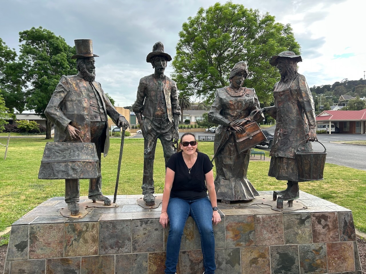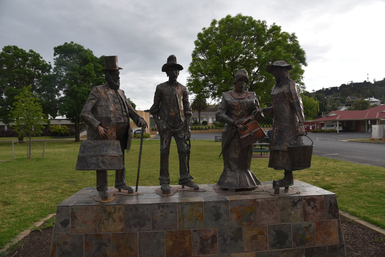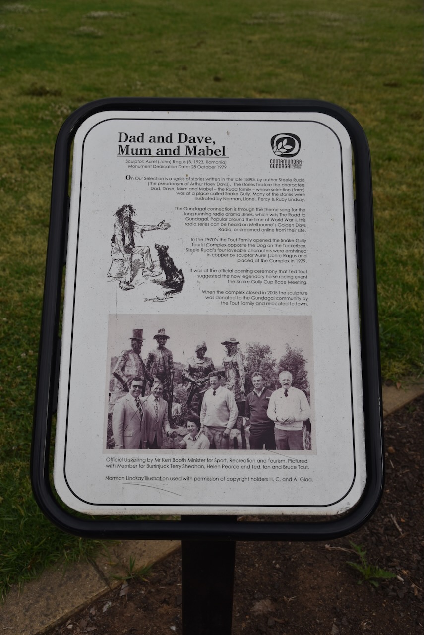 We then visited the Dad and Dave, Mum and Mabel sculptures in Gundagai. The sculptures were originally located at the Snake Gully Tourist complex opposite the Dog On The Tuckerbox. When the complex closed, they were donated to the community and moved to its current location. (Gundagai Visitor Info Centre n.d.)