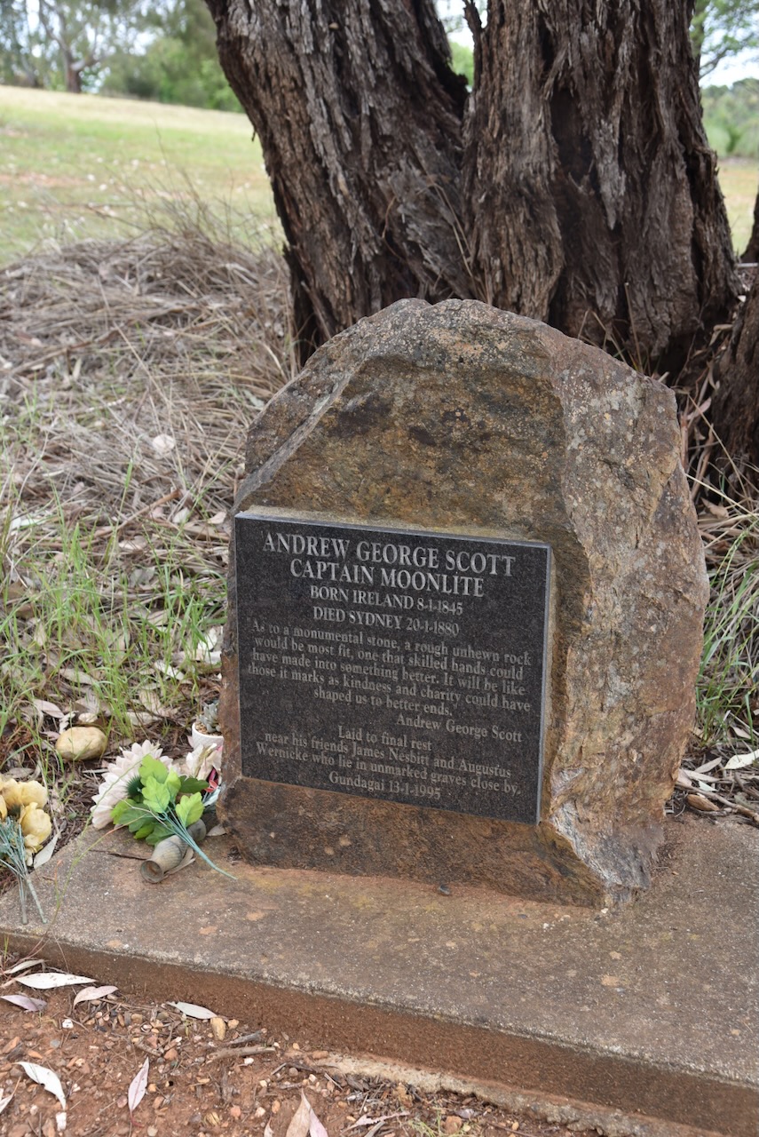 Scott’s final request before being hanged was to be buried in the same grave as his constant companion, James Nesbitt. This was denied by the authorities, and he was buried at Rookwood Cemetery. In January 1995, Scott’s remains were exhumed, and he was reinterred at the North Gundagai Cemetery alongside Nesbitt’s grave, which is unmarked. Gang member Augustus Ernest Diedrich William ‘Gus’ Wernicke is also buried nearby in an unmarked grave. He was just 15 years old when shot by police at Wantabadgery. (Captain Moonlite 2024) (Findagrave.com 2016)