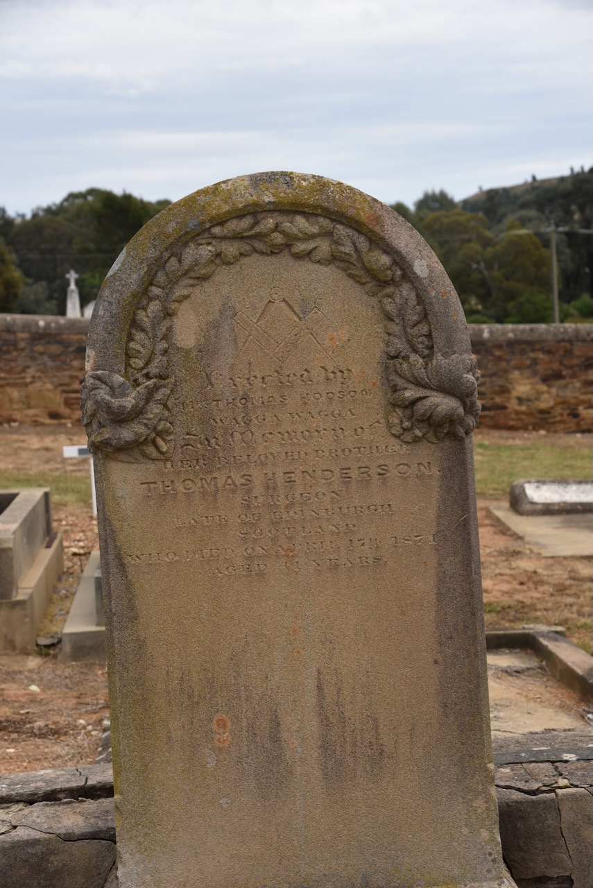 Thomas Henderson was born on the 8th day of December 1829 in Midlothian, Scotland. After emigrating to Australia, he married Emily Martha Josephine Harricks at Tumut, NSW. They had 2 children. Thomas was a surgeon and chemist in Gundagai. He died on the 17th day of April 1874 at Gundagai, aged 44 years. (ancestry 2016)