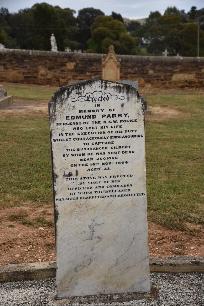Sergeant Edmund Parry was shot dead whilst attempting to capture the bushranger John Gilbert near Jugiong. He was 32 years old. His headstone was erected by ‘some of his officers and comrades by whom the deceased was much respected nd regretted.’