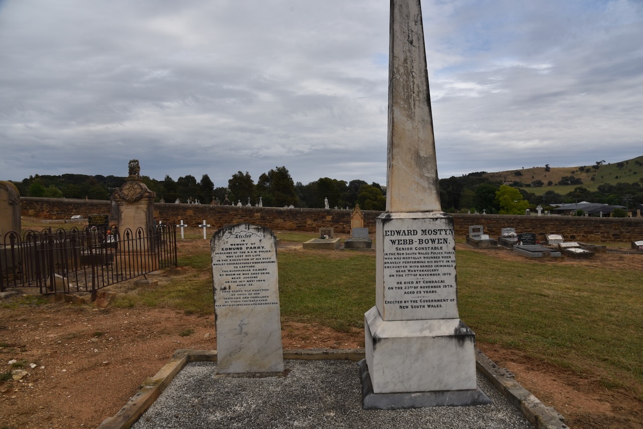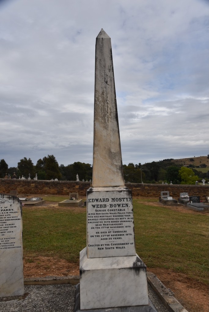 Constable Edward Mostyn Webb-Bowen, who was killed in the shootout with Scott’s gang, is also buried at the North Gundagai Cemetery. As is Sergeant Edmund Parry who I spoke about in my Tidbinbilla post.