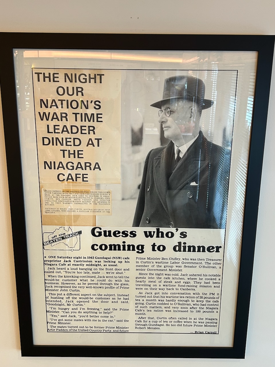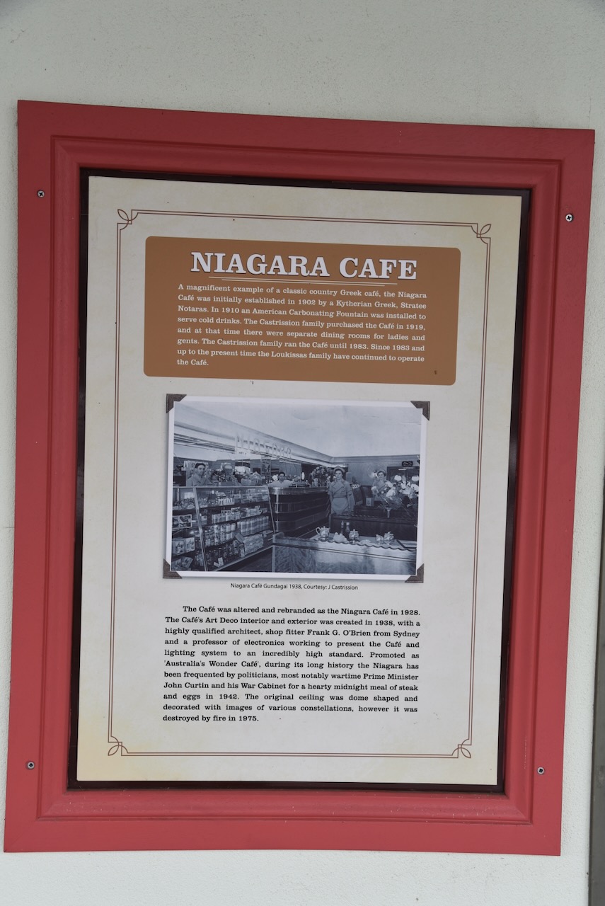 In 1938, the cafe’s Art Deco interior and exterior were created with the services of a highly qualified architect, shop fitter Frank G. O’Brien from Sydney and a professor of electronics working to present the cafe and lighting system to an incredibly high standard. The Niagara Cafe was promoted as ‘Australia’s Wonder Cafe’. It has been frequented by politicians, including Prime Minister John Curtin and his War Cabinet during the 1940s.