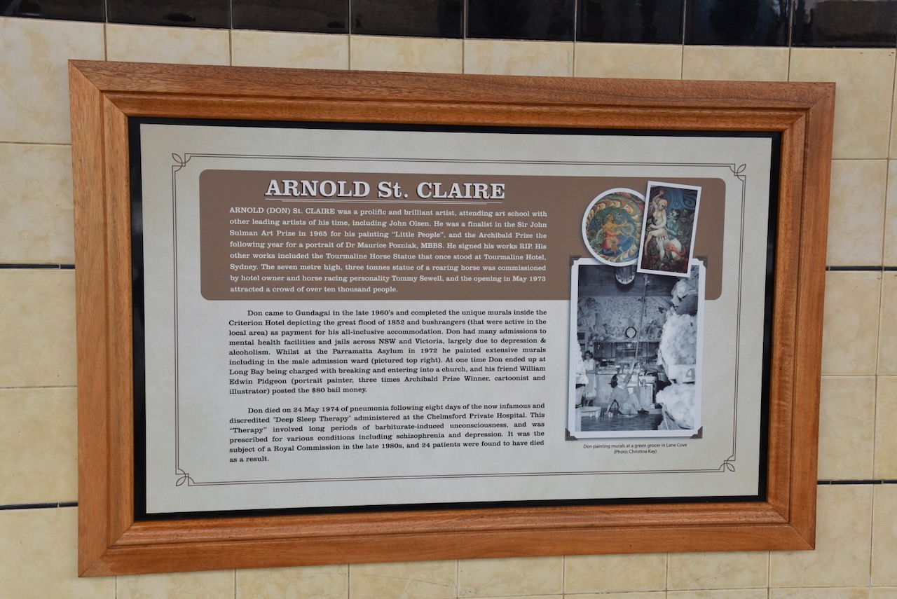 St Claire was a regular cartoonist for the Campbelltown Ingleburn News. In 1966, St Claire held an art exhibition in a butcher’s shop. During the 1970s St Claire completed a 7 metre high statue of a rearing horse which stood in the forecourt of the Tourmaline Hotel. (Allen 2026)