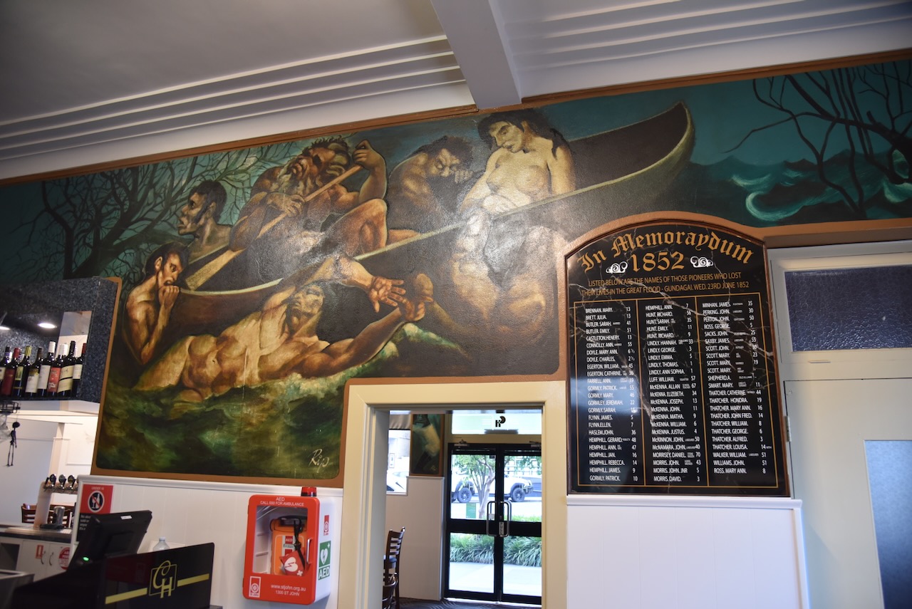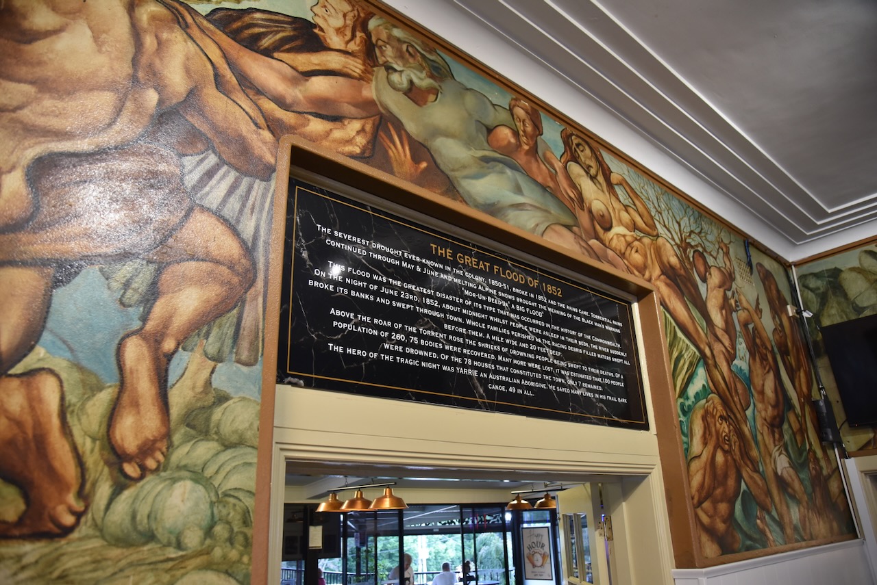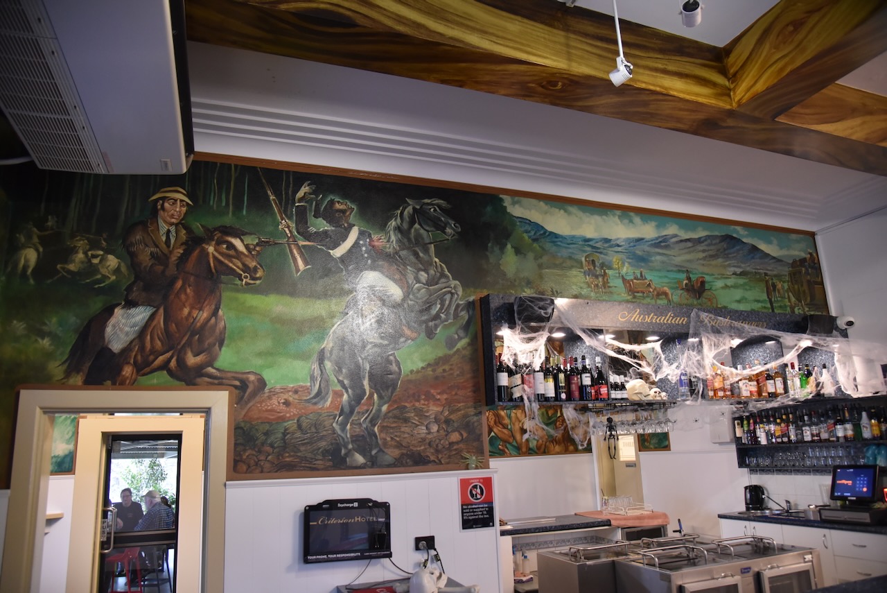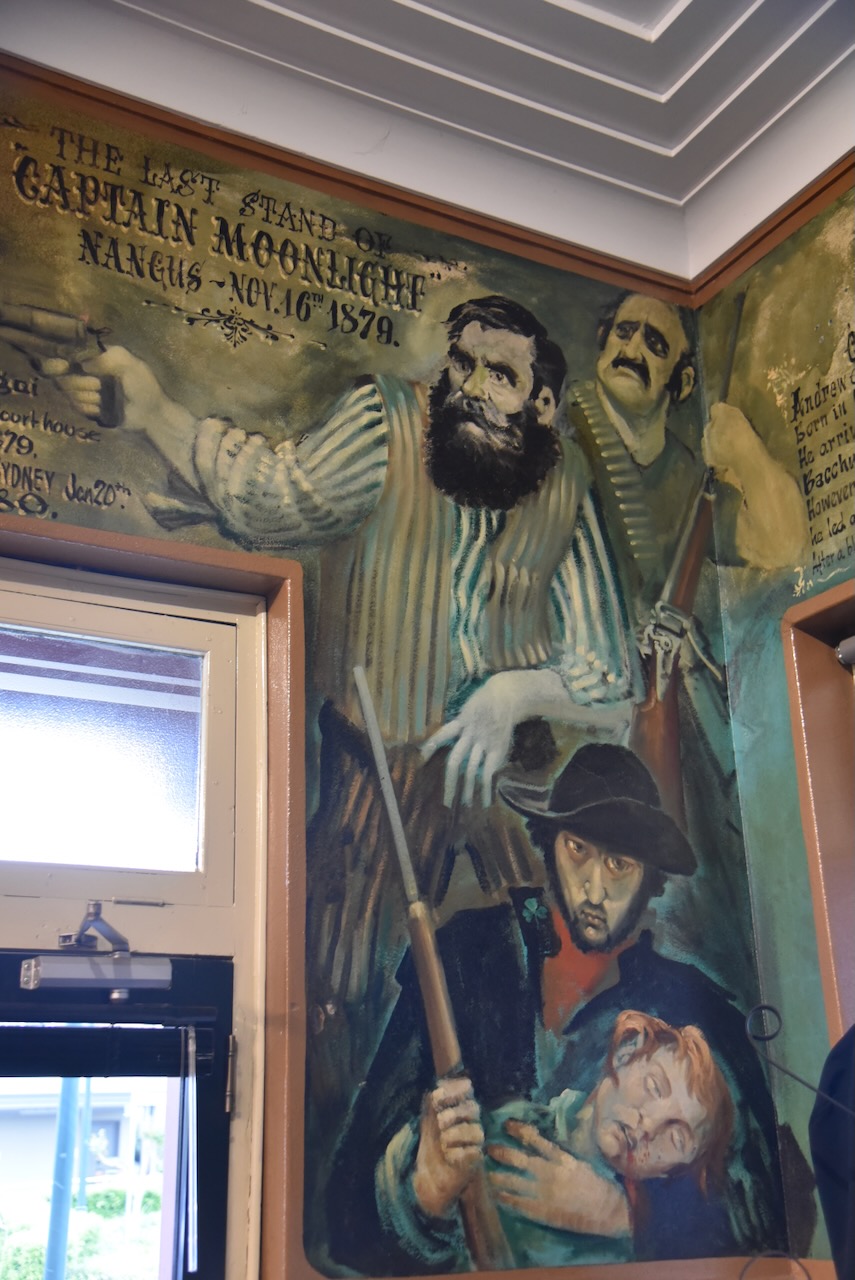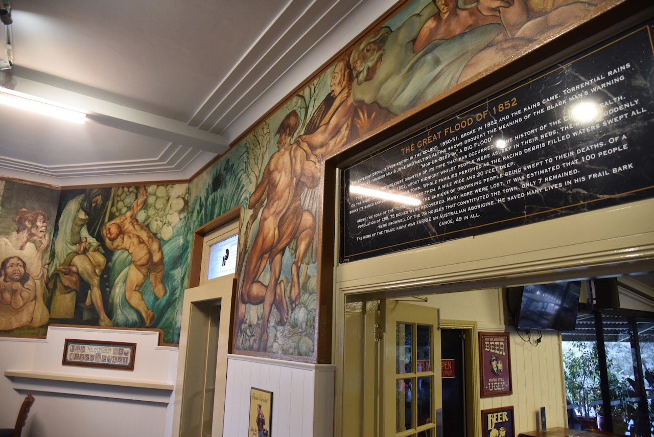 The hotel features some magnificent murals on its walls in the bar area. They depict the Gundagai flood and Captain Moonlite. The murals are the work of artist Arnold ‘Don’ St Claire who completed the murals during the 1960s. He was a finalist in the 1965 Sulman Prize and the Archibald Prize in 1966. (JAM Admin 2023)
