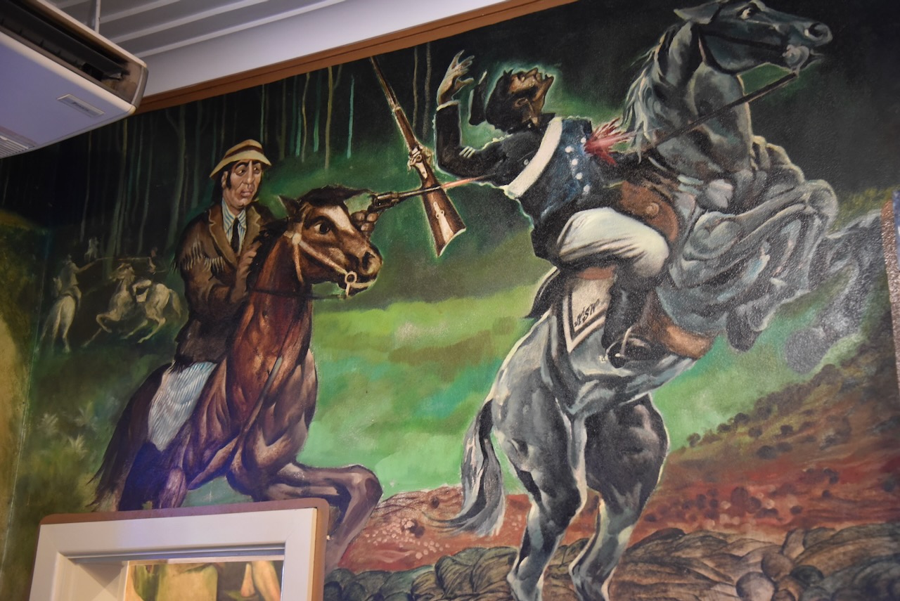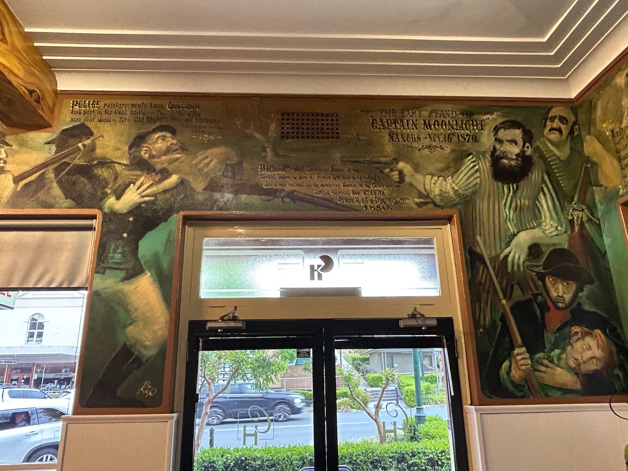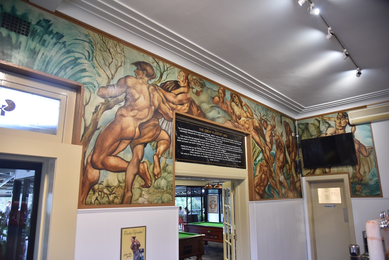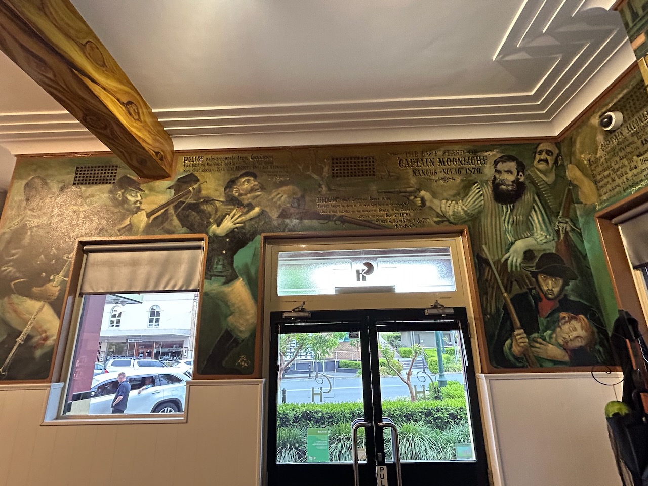 The hotel features some magnificent murals on its walls in the bar area. They depict the Gundagai flood and Captain Moonlite. The murals are the work of artist Arnold ‘Don’ St Claire who completed the murals during the 1960s. He was a finalist in the 1965 Sulman Prize and the Archibald Prize in 1966. (JAM Admin 2023)