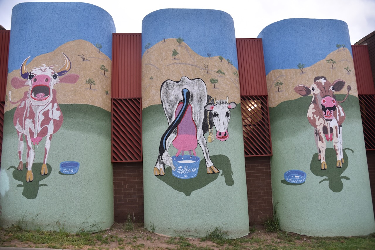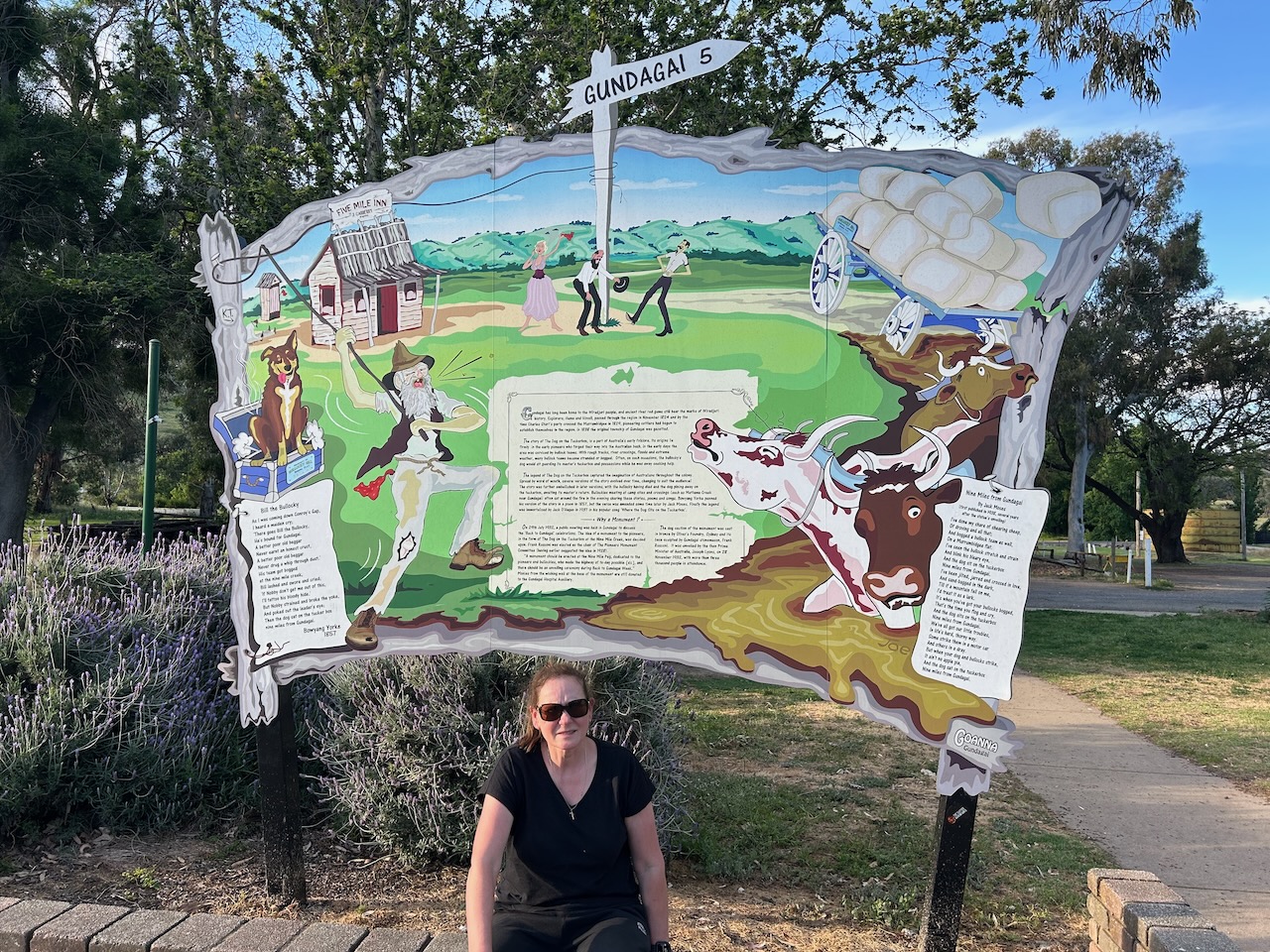 Marija and I walked down the street to have a look at the ‘Three Sisters of Gundagai’ mural. The mural was completed in 2021 and is the work of artist Yiannia Johns. The mural depicts Melba XV, a milking cow from Darbalara, who in 1924 became the world’s champion butter-fat cow. (Mural 2022)