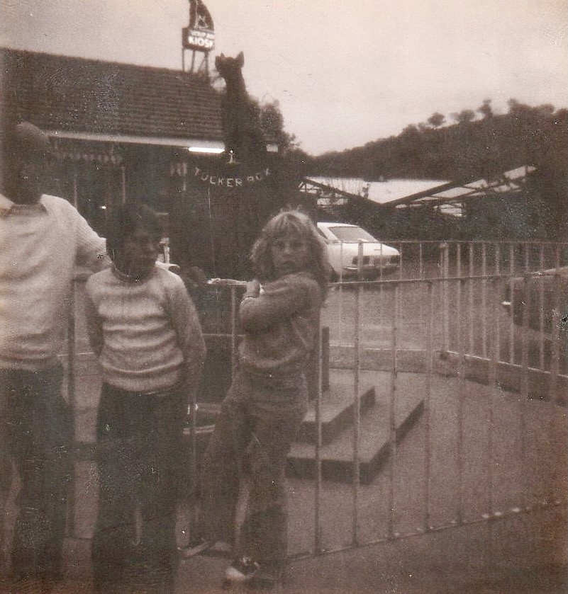 When I last visited the Dog On The Tuckerbox, the Hume Highway passed right by the Dog, and if my memory recalls correctly, there were lots of tourists stopping to admire the monument and visit the adjacent souvenir shop. While preparing this post, I went through some old photo albums and found the photo below showing myself, my Dad and my sister at the Dog On The Tuckerbox in c. 1977. The photo was taken on a Polaroid instant camera, which became very popular in Australia during the 1970s.