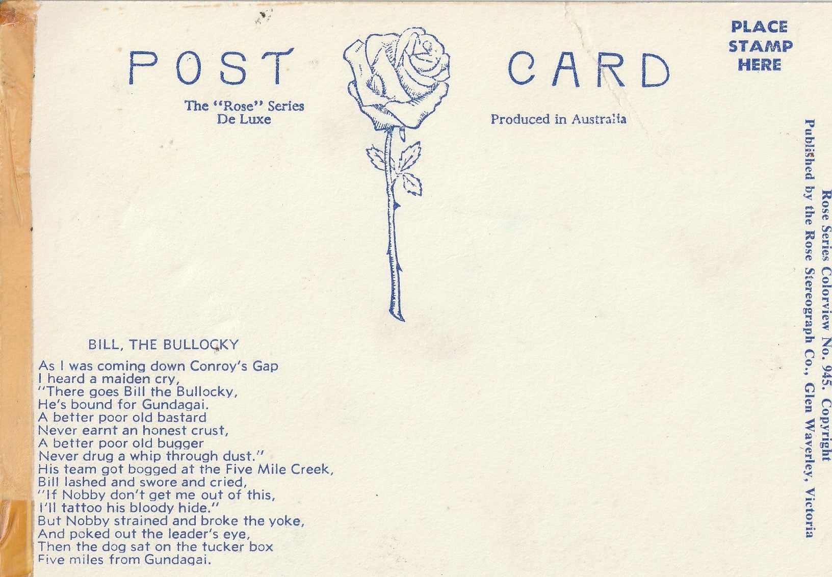 While going through my boxes of memorabilia, I also found this postcard that I purchased back in the 1970s when visiting The Dog On The Tuckerbox. It has the words to Bill the Bullocky on the rear.