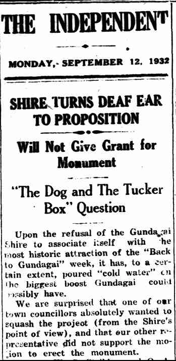 Unfortunately, the Gundagai Shire did not support the proposal for the erection of the Dog On The Tuckerbox monument.