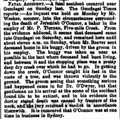 Jeremiah O’Connor was born in c. 1834 in County Kerry, Ireland. Five Mile Creek near Gundagai. (ancestry 2016) (Nla.gov.au 2026)