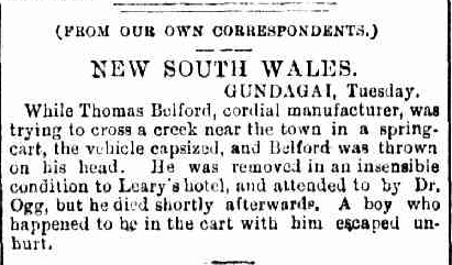 Thomas Belford was born in 1841 in Galway, Ireland. He emigrated to Australia, and in 1873, he married Ellen Ryan at Gundagai. They had four children. Thomas was a cordial manufacturer. Thomas died on the 14th day of February 1882, at Gundagai. He was attempting to cross a creek in a sprint cart when it capsized. Thomas was thrown on his head. It was reported that he was ‘removed in an insensible condition’ to Leary’s Hotel, where he was attended by Dr Ogg. Sadly, he died shortly afterwards. A boy who was in the cart at the time escaped unhurt. (ancestry 2016) (Nla.gov.au 2026)
