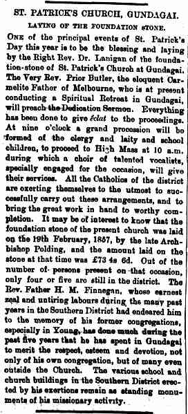 - Trove. (2026). ST. PATRICK’S CHURCH, GUNDAGAI. – The Gundagai Times and Tumut, Adelong and Murrumbidgee District Advertiser (NSW : 1868 – 1931) – 5 Jun 1885. [online] Available at: https://trove.nla.gov.au/newspaper/article/123467434?searchTerm=st%20patrick%27s%20church%20gundagai [Accessed 7 Mar. 2026].