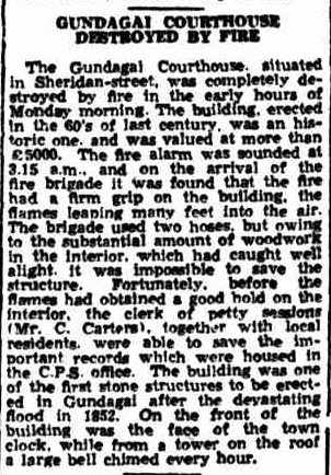 The interior of the courthouse was destroyed in a fire in 1943. It was rebuilt with an opening ceremony taking place on the 25th day of March 1944. Three days later, Gundagai’s first official visit from a State Governor occurred, with a visit to the courthouse by Lord Wakehurst. (Nsw.gov.au 2026)