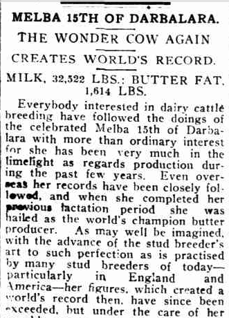 Melba XV, in her heyday, was able to produce 743.5 pounds of milk and 28.7 pounds of butter fat during a 7-day period.
