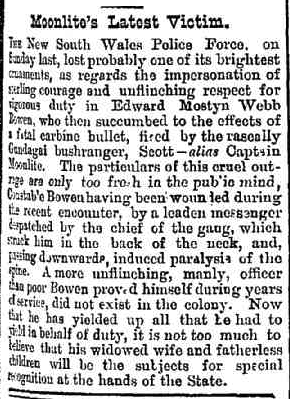Constable Webb-Bowen succumbed to his injuries a few days after being shot. His funeral took place in Gundagai on Monday 29th May 1899. It was reported to be one of the largest funerals that ever took place in Gundagai. (Trove 2026)