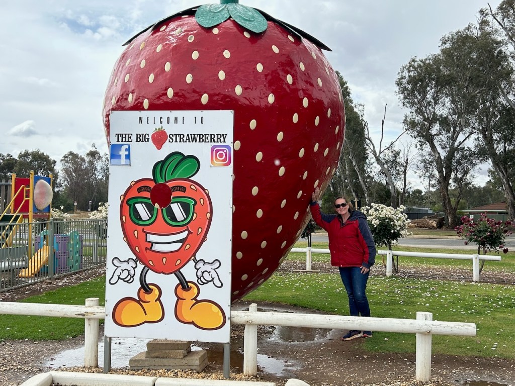 We drove south on the Goulburn Valley Highway and reached Koonoomoo. We were hoping to call into the Big Strawberry at Koonoomoo, but unfortunately, it was closed. That might have been a blessing in disguise, as we were still full from our lunch in Tocumwal and the very nice ice cream at the Tocumwal Ice Creamery.
