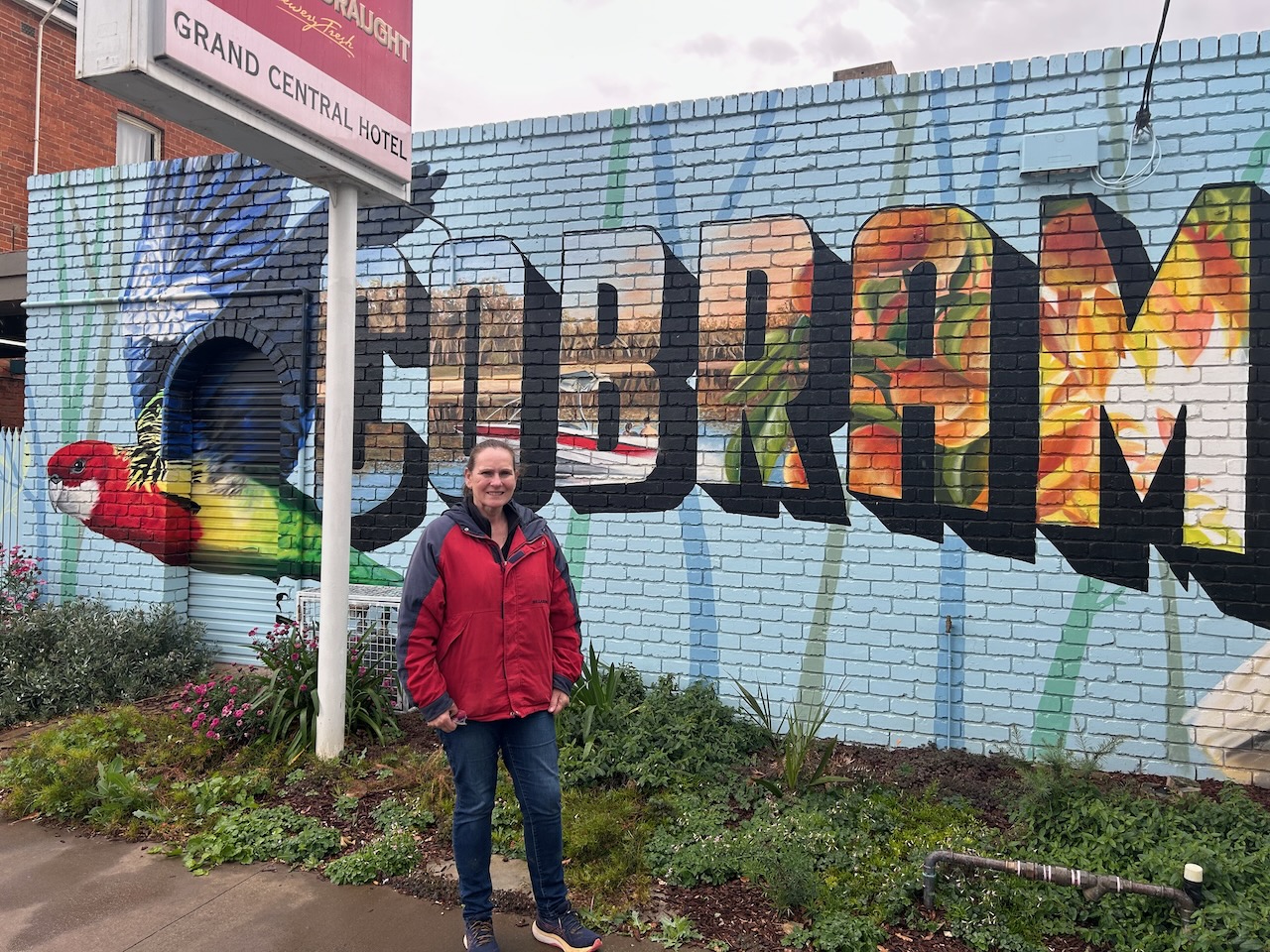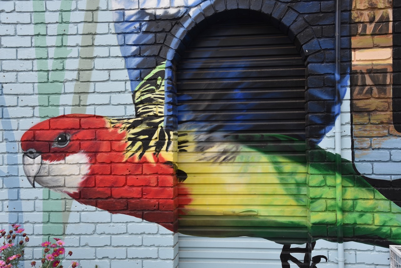 We found this beautiful mural on the side of the chemist’s alongside the Grand Central Hotel. The mural features a Sulphur-crested Cockatoo and a Rosella
