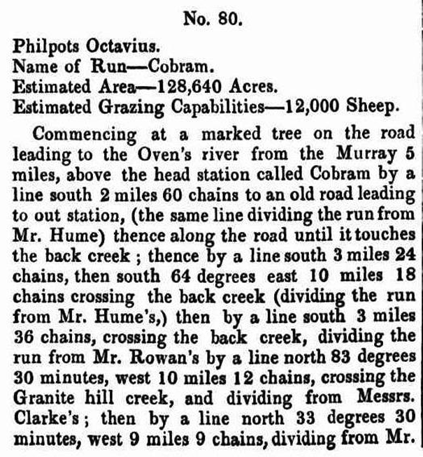 Octavius Philpotts was born in 1822 in Durham, England. His father, Henry Philpotts, was the Bishop of Exeter. In February 1860, he married Georgina Harriet Lane in Plymouth, Devon, England. In January 1855 the run was subdivided into the runs of Cobram and St James. In 1864, Philpotts sold the Cobram property. He died on the 31st day of January 1869 in Devon, England. (ancestry 2016) (Cockatoo Grove 2025)
