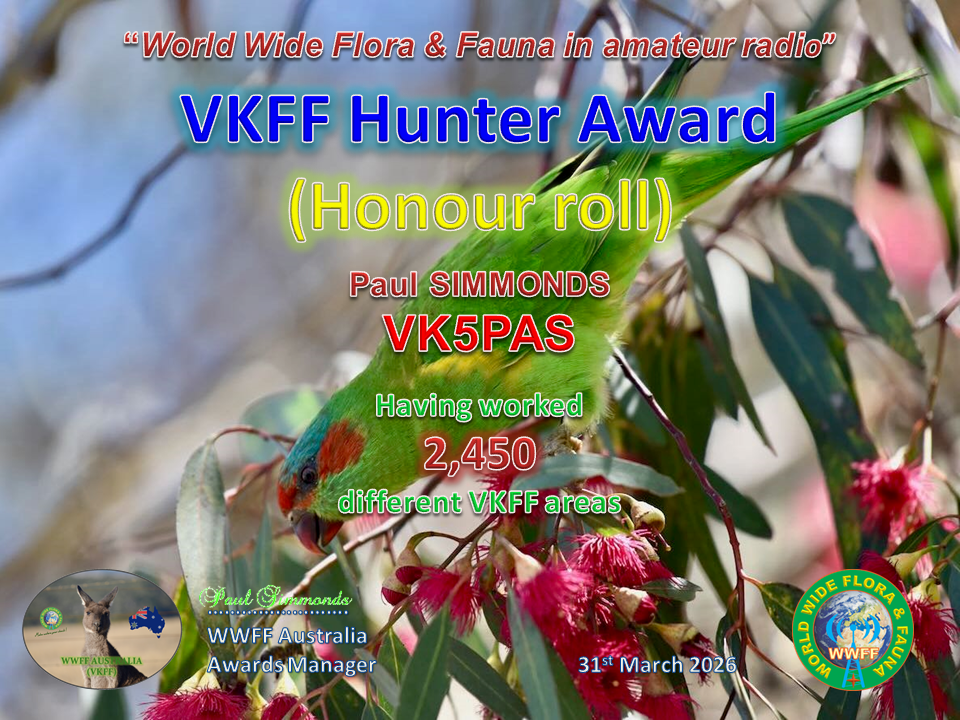 Thank you to all of the VKFF Hunters, and thank you to Adam VK2YK, the VK5 VKFF State rep, for the certificate.