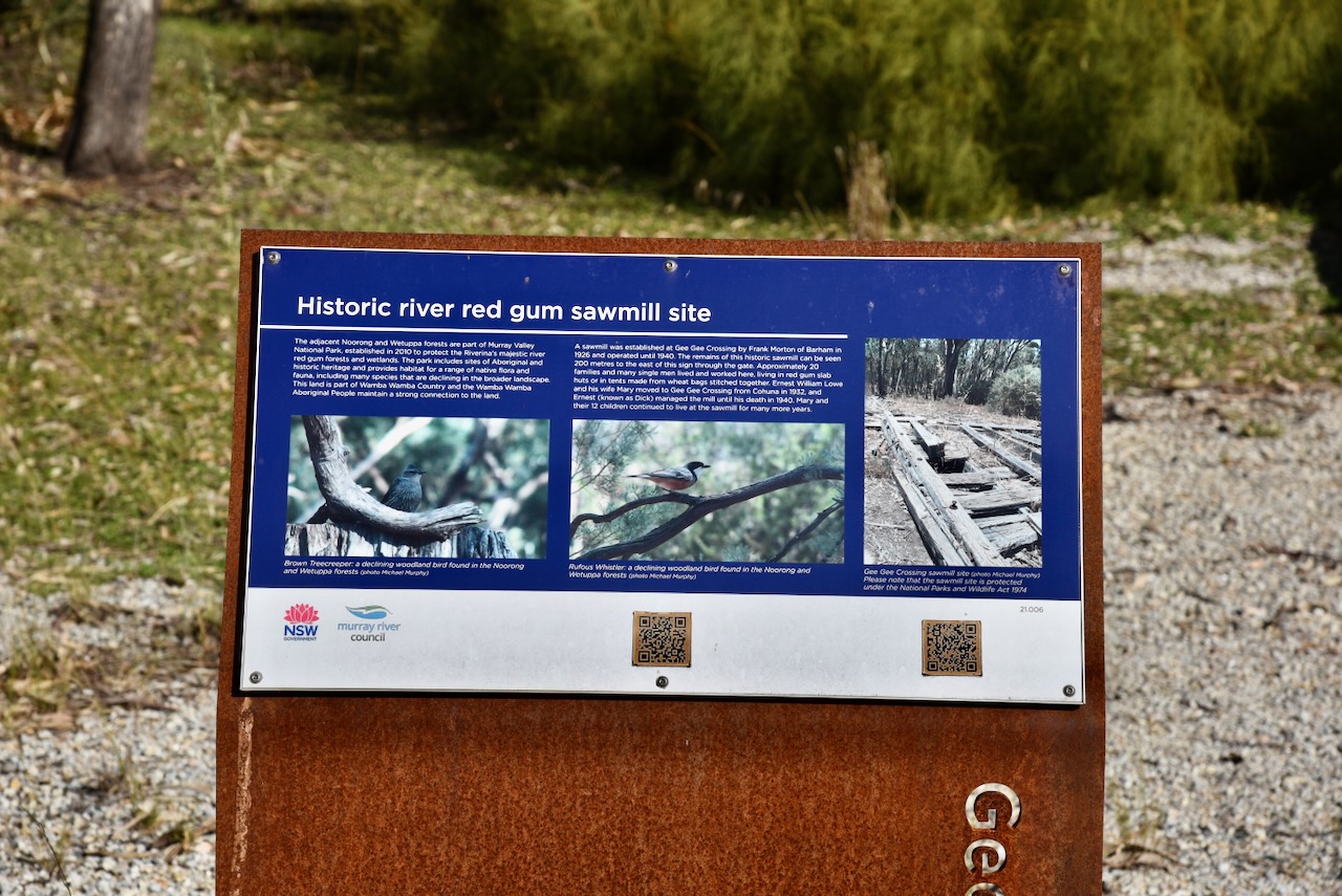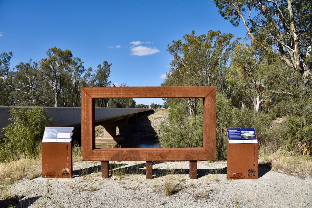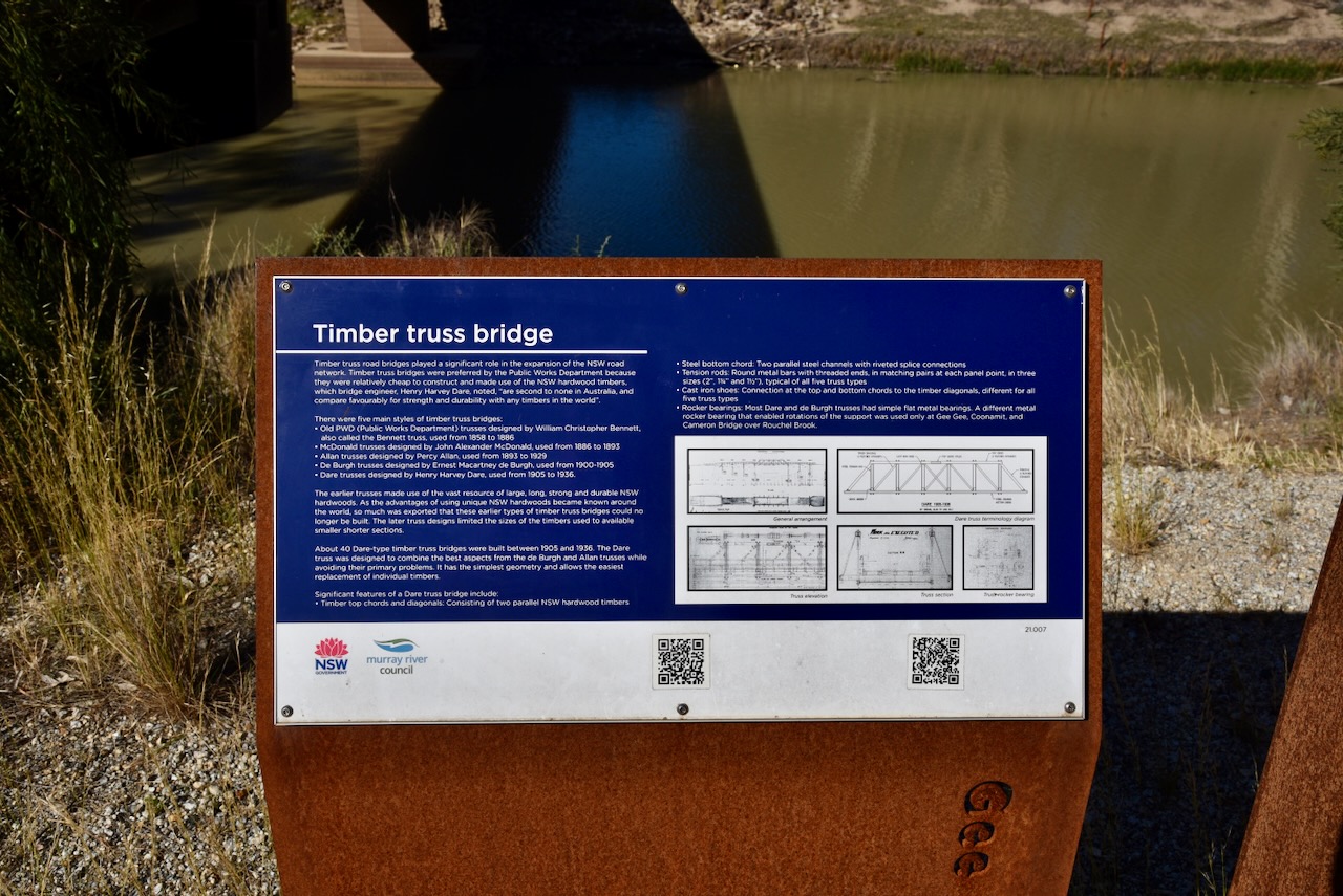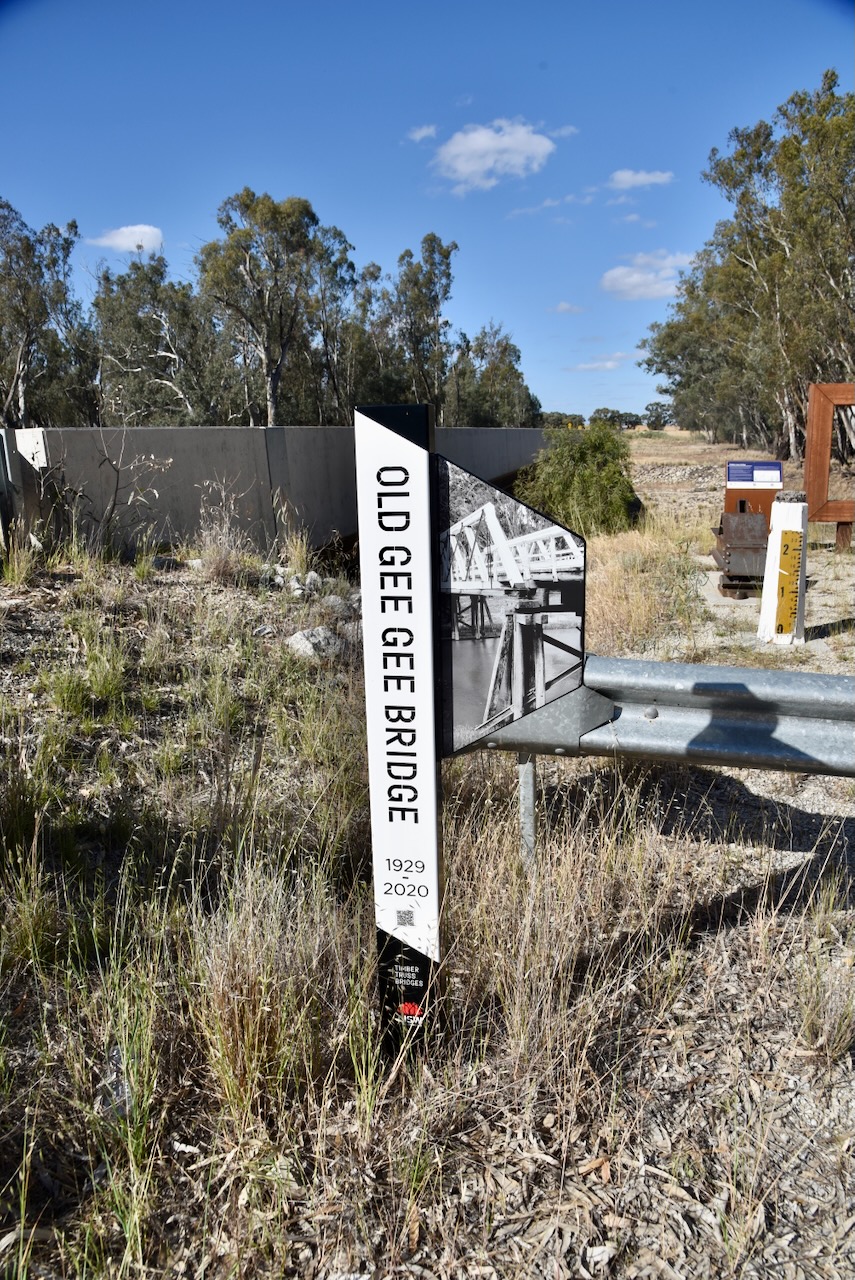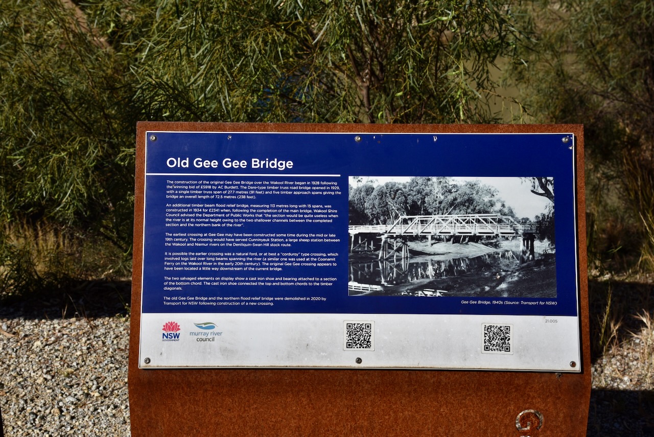 We then stopped at the old Gee Gee Bridge on Noorong Road. Sadly, the heritage-listed bridge that crossed the Wakool River was demolished after the construction of a concrete bridge in 2020. The bridge was built in 1929 and was designed by Harvey Dare, who was the designer of various bridges. (Wikipedia 2024)