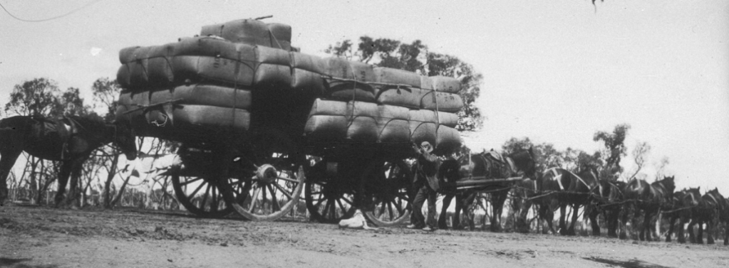Above: a wagon load of Noorong wool on the way to Koondrook Railway Station. Image c/o Mitchell Library, State Library of New South Wales