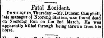 Duncan Campbell was the Manager at Noorong Run. He died on the 2nd day of March 1879 at Noorong Run, having been thrown from his horse. (Trove 2026)