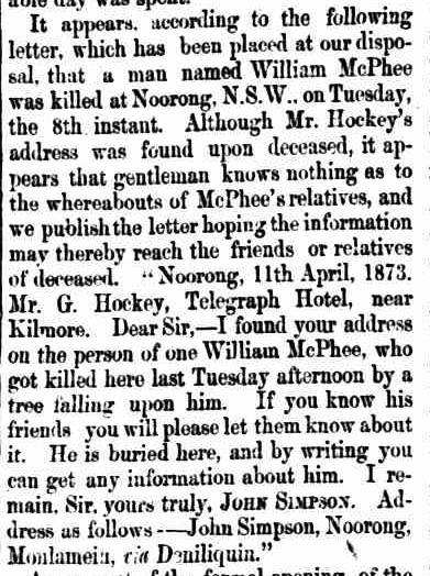 William McPhee died on the 8th day of April 1873, at Noorong, after a tree fell on him. (Trove 2026)