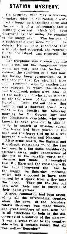 It was feared that the Constable from Moulamein and Mr George Oare had met their fate while searching for missing sheep. The horse from the buggy was located tied to a tree between Moulamein and Noorong. After an extensive search, the two missing men were found in a hut. It was established that the Constable and Oare had found a fire in the buggy on Saturday morning, believed to be caused by a spark from a fire. They extinguished the fire and continued in their search for the sheep. (Trove 2026)