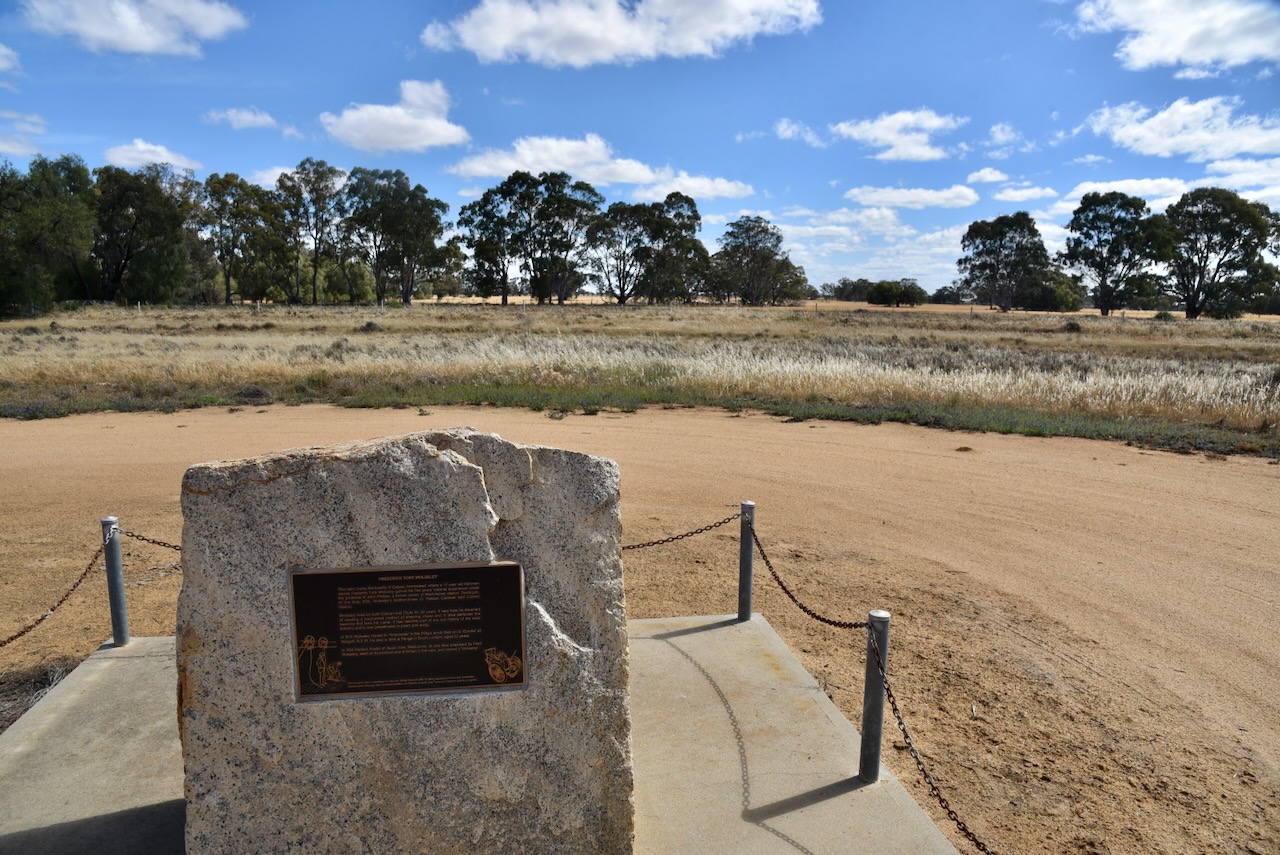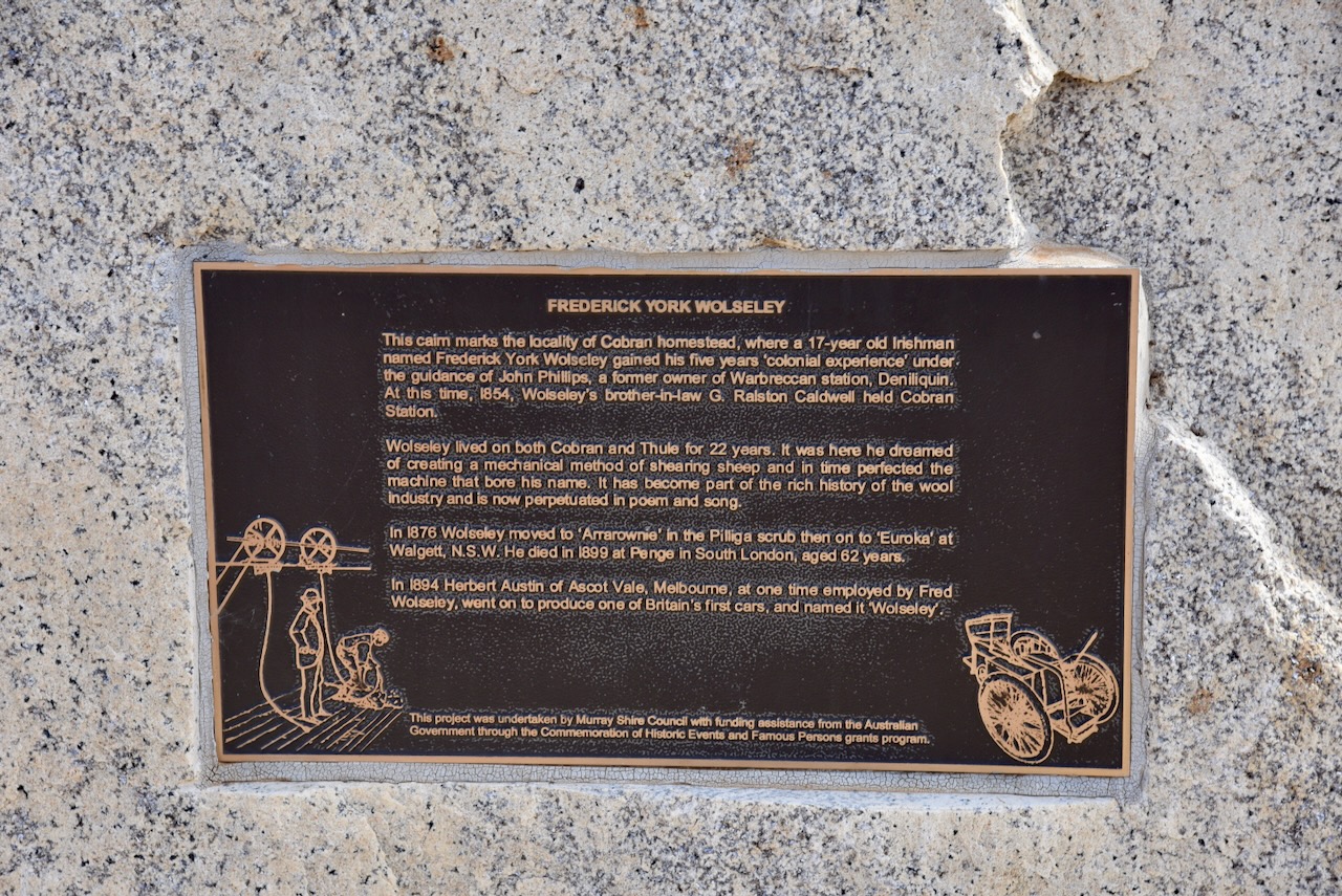 On the Wakool Road at Yallakool, we stopped at the Frederick York Wolseley monument. The cairn marks the locality of Cobran homestead and Frederick Wolseley, who invented the mechanical method of shearing sheep.