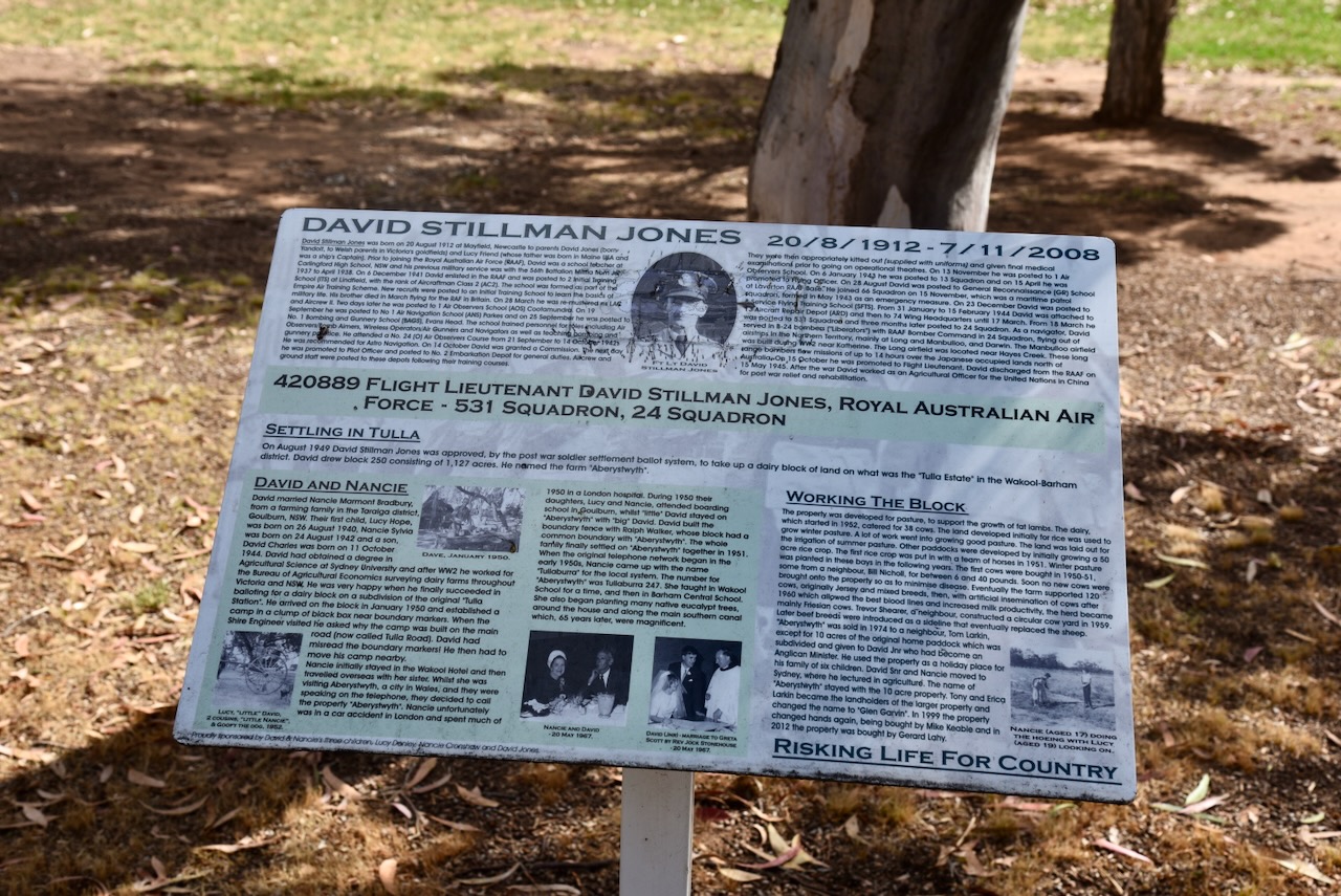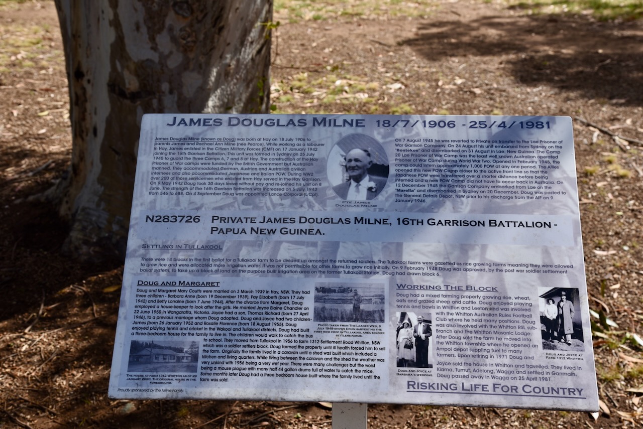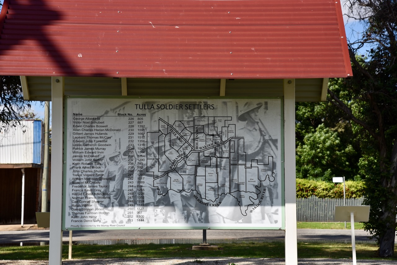 Marija and I visited the Wakool Soldier Settlers Memorial Walk. There are several information signs that detail the life of former service people from Wakool, North Wakool, Tulla, Tullakool, Merriginnie, and Chowar. (Service 2023)