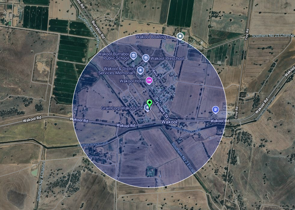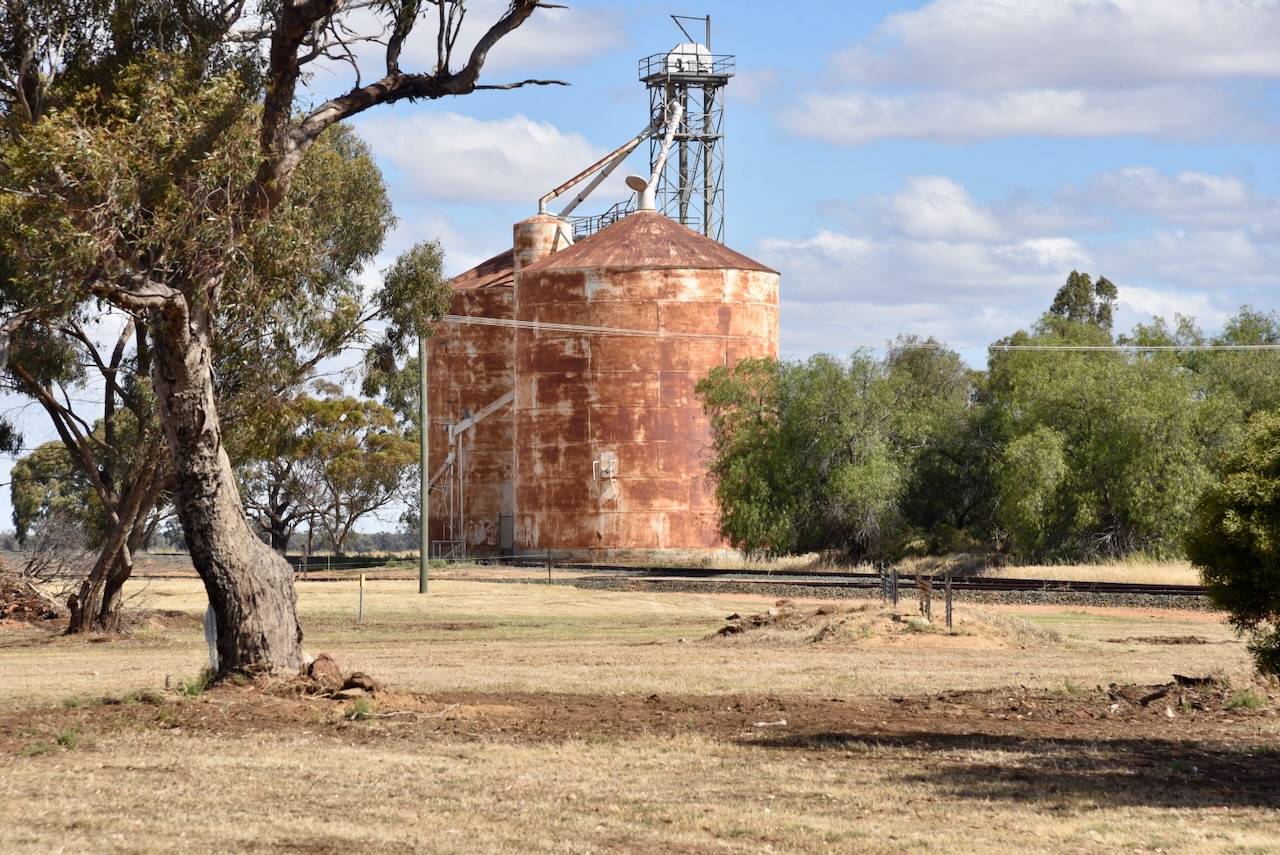 The Wakool silos are located in between Wakoola Street and Flinders Street, on the Balranald railway line.
