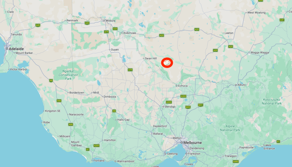 Above: Map showing the location of Wakool, N.S.W. Map c/o Google Maps