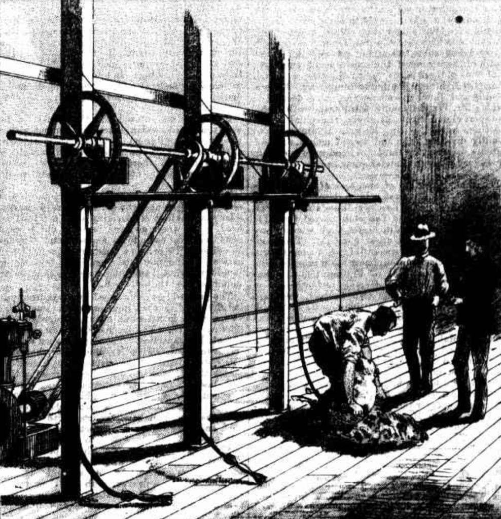 Above: An image featuring the Wolseley sheep shearing machine in an 1887 issue of the Queensland Figaro and Punch, Sat 9 Apr 1887. Image c/o Trove