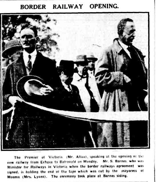 The opening ceremony of the line took place on Monday, the 5th day of April 1926, at Barnes Siding, which was named after Mr Barnes MLA, who was the Minister for Railways in Victoria.