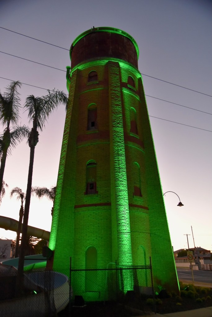 We then drove back into Swan Hill, stopping briefly to admire the Swan Hill water tower, which was lit up. The water tower was constructed in 1883.