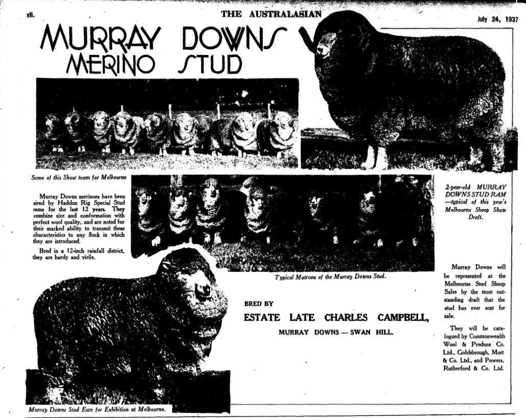 In 1847, one of the first official leaseholds was granted for Murray Downs. From c. 1862 Murray Downs was owned by Suetonius and Charles Officer. The run was 150,000 acres in size. In 1870, the Murray Downs homestead was built. In 1884, Charles Campbell entered into a partnership with Alfred Felton to purchase Murray Downs. They established the largest irrigated area at that time on the Murray River. In 1889, Murray Downs sent 397 bales of wool downriver to Echuca. (Flickr 2026) (Poynter 2005)
