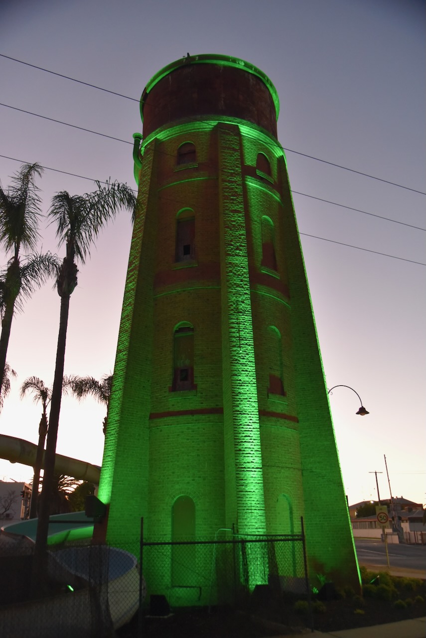 We then drove back into Swan Hill, stopping briefly to admire the Swan Hill water tower, which was lit up. The water tower was constructed in 1883.