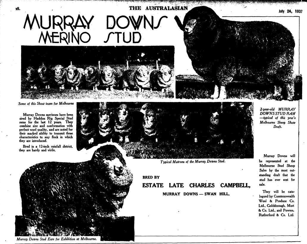 In 1847, one of the first official leaseholds was granted for Murray Downs. From c. 1862 Murray Downs was owned by Suetonius and Charles Officer. The run was 150,000 acres in size. In 1870, the Murray Downs homestead was built. In 1884, Charles Campbell entered into a partnership with Alfred Felton to purchase Murray Downs. They established the largest irrigated area at that time on the Murray River. In 1889, Murray Downs sent 397 bales of wool downriver to Echuca. (Flickr 2026) (Poynter 2005)