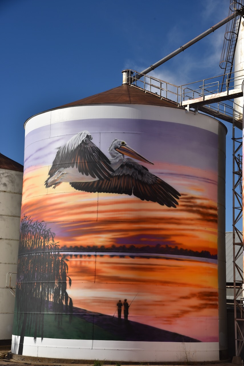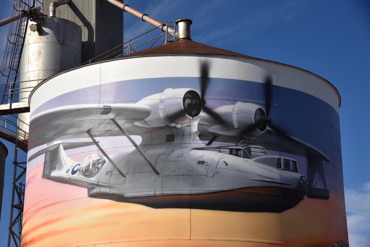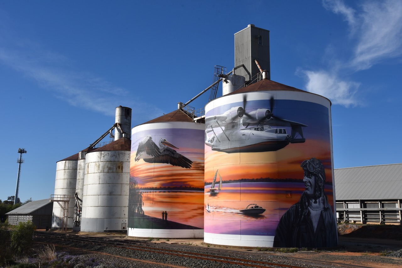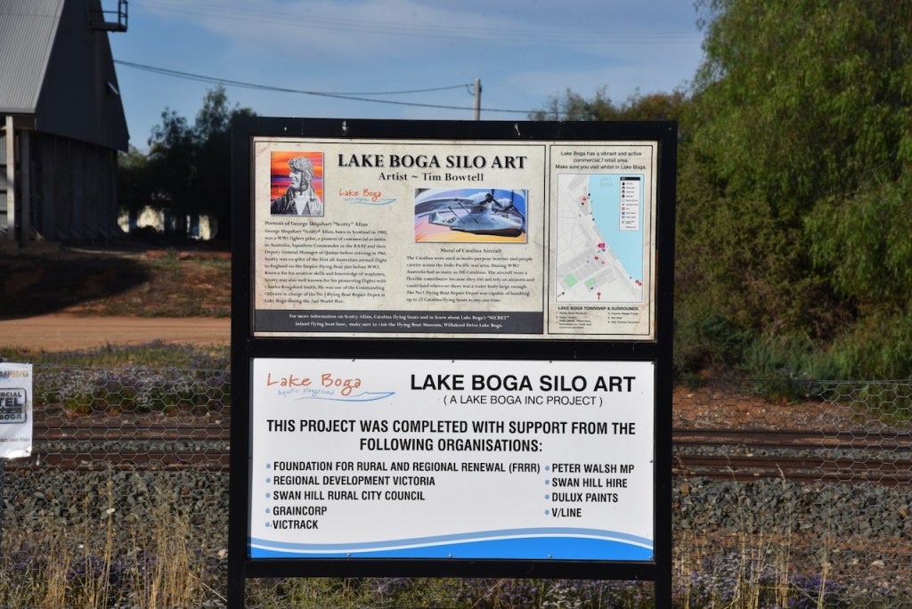 The Lake Boga silos are part of the Australian Silo Art Trail and feature magnificent art, the work of Tim Bowtell. They were completed in October 2023 and feature a Pelican, a speedboat on Lake Boga, a Catalina Flying Boat and its commanding officer, George ‘Scotty’ Urquhart Allan. (Australiansiloarttrail.com 2023)