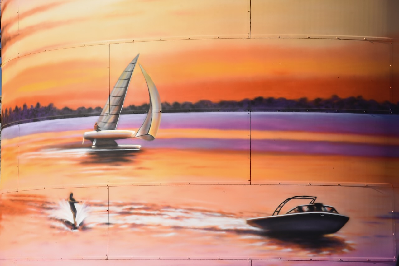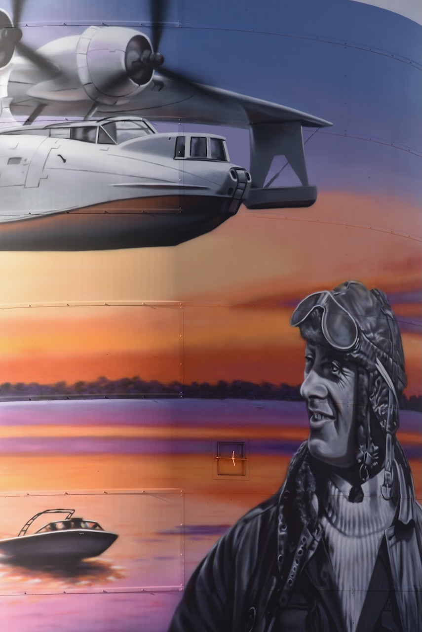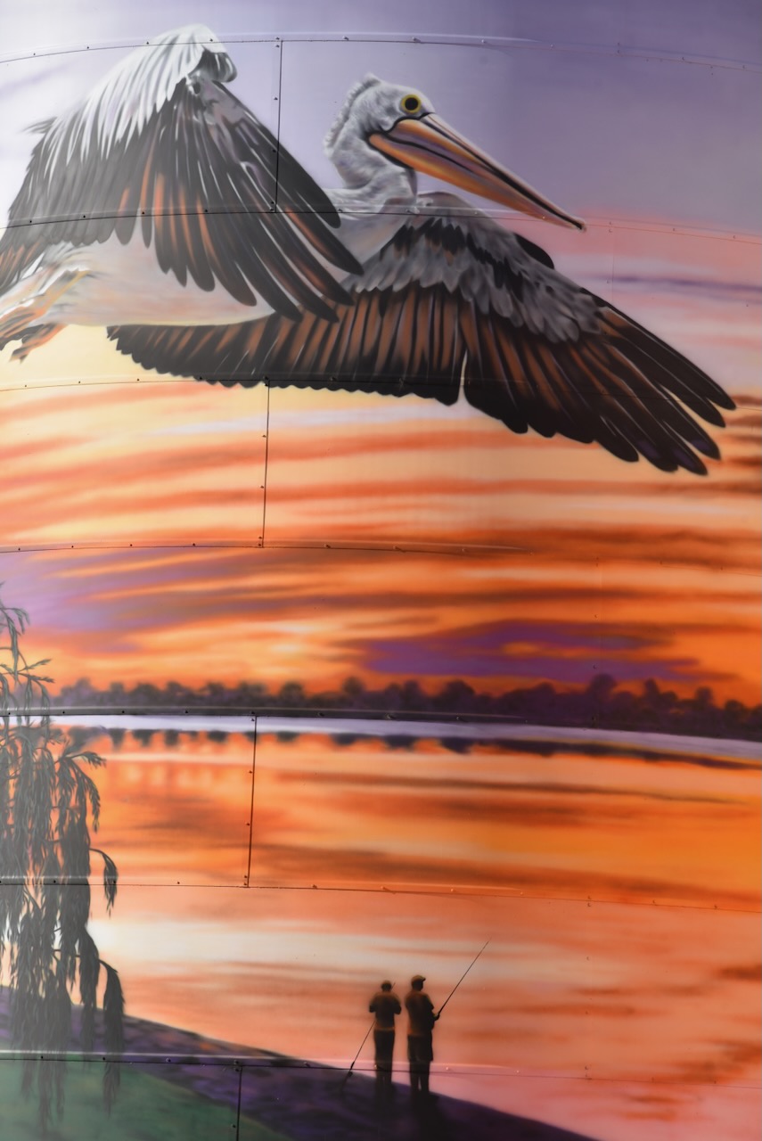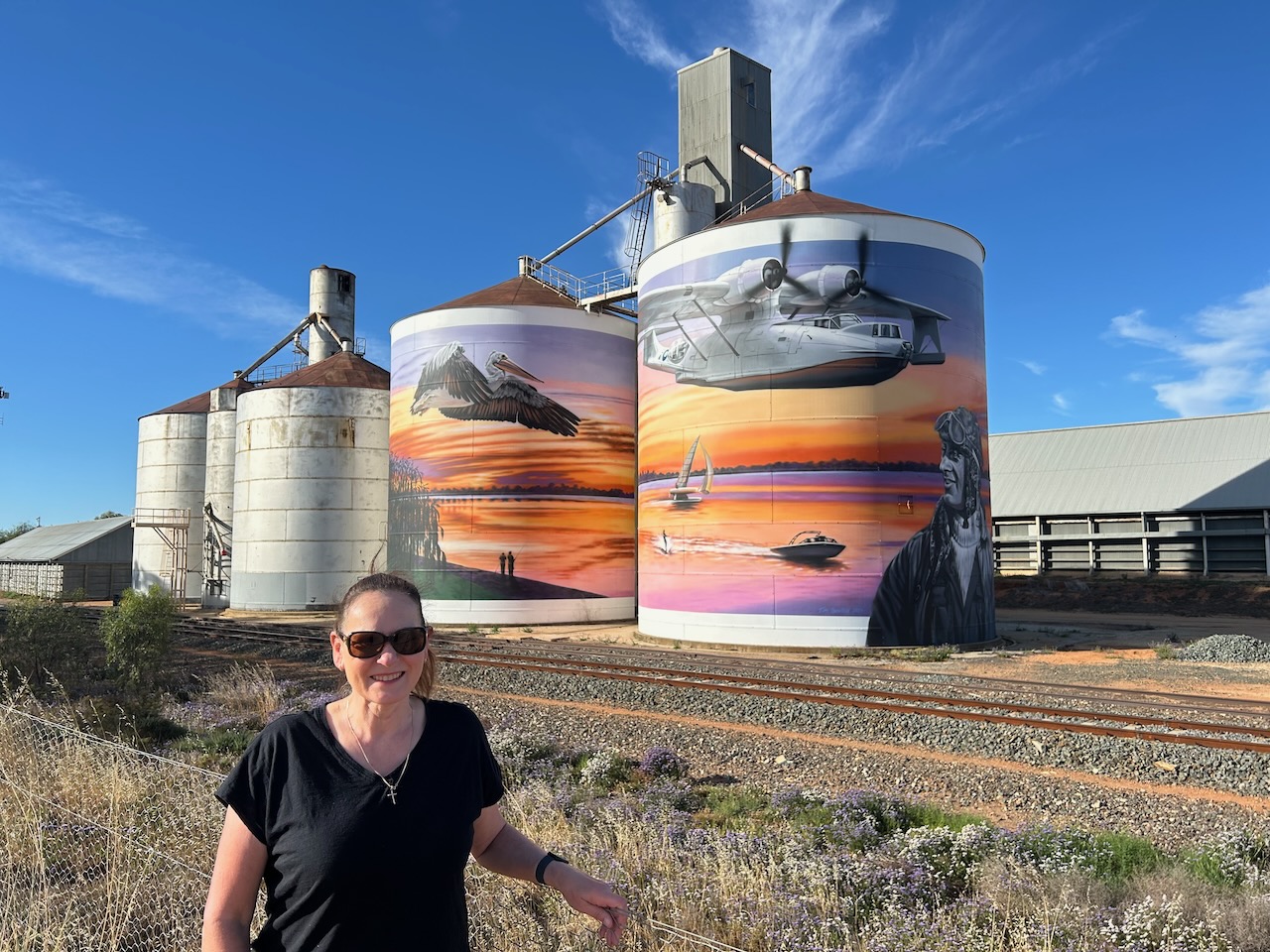 The Lake Boga silos are part of the Australian Silo Art Trail and feature magnificent art, the work of Tim Bowtell. They were completed in October 2023 and feature a Pelican, a speedboat on Lake Boga, a Catalina Flying Boat and its commanding officer, George ‘Scotty’ Urquhart Allan. (Australiansiloarttrail.com 2023)