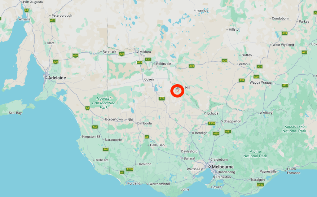 Above: Map showing the location of Lake Boga, Victoria. Map c/o Google Maps