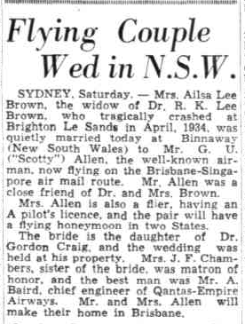 On the 22nd day of June 1935, Allan married Dr Brown’s widow, Ailsa Lee-Brown, in Binnaway, New South Wales. Ailsa was also a pilot and an artist. (ancestry 2016) (Trove 2026) (Wikitree 2026)