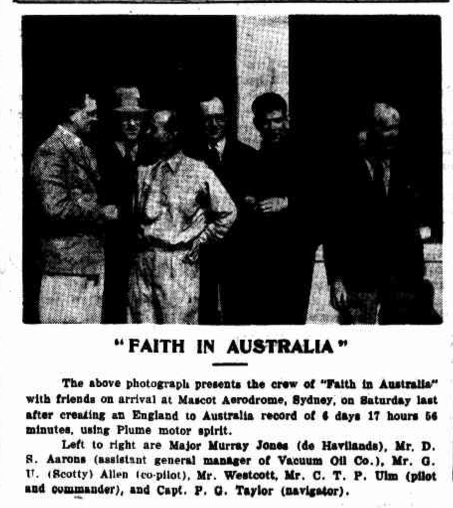 In 1929, he emigrated to Australia and commenced work for Charles Ulm and Charles Kingsford Smith at Australian National Airways. He soon gained a reputation for his exceptional piloting skills, particularly in the Avro X aircraft. He was involved in the first airmail flights from Sydney to Brisbane with Kingsford-Smith and from Sydney to Melbourne with Pat Hall. He acted as a co-pilot for Kingsford-Smith and Ulm on several long-distance flights. In 1933, he flew aboard the aircraft ‘Faith in Australia’, with Charles Ulm and Sir Patrick Gordon Taylor on the record-breaking flight from England to Australia. The following year, in 1934, he joined QANTAS, where he flew aircraft between Brisbane and Singapore. (Australiansiloarttrail.com 2023)
