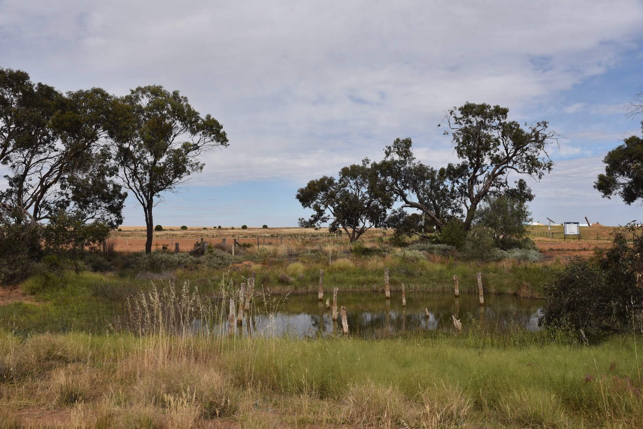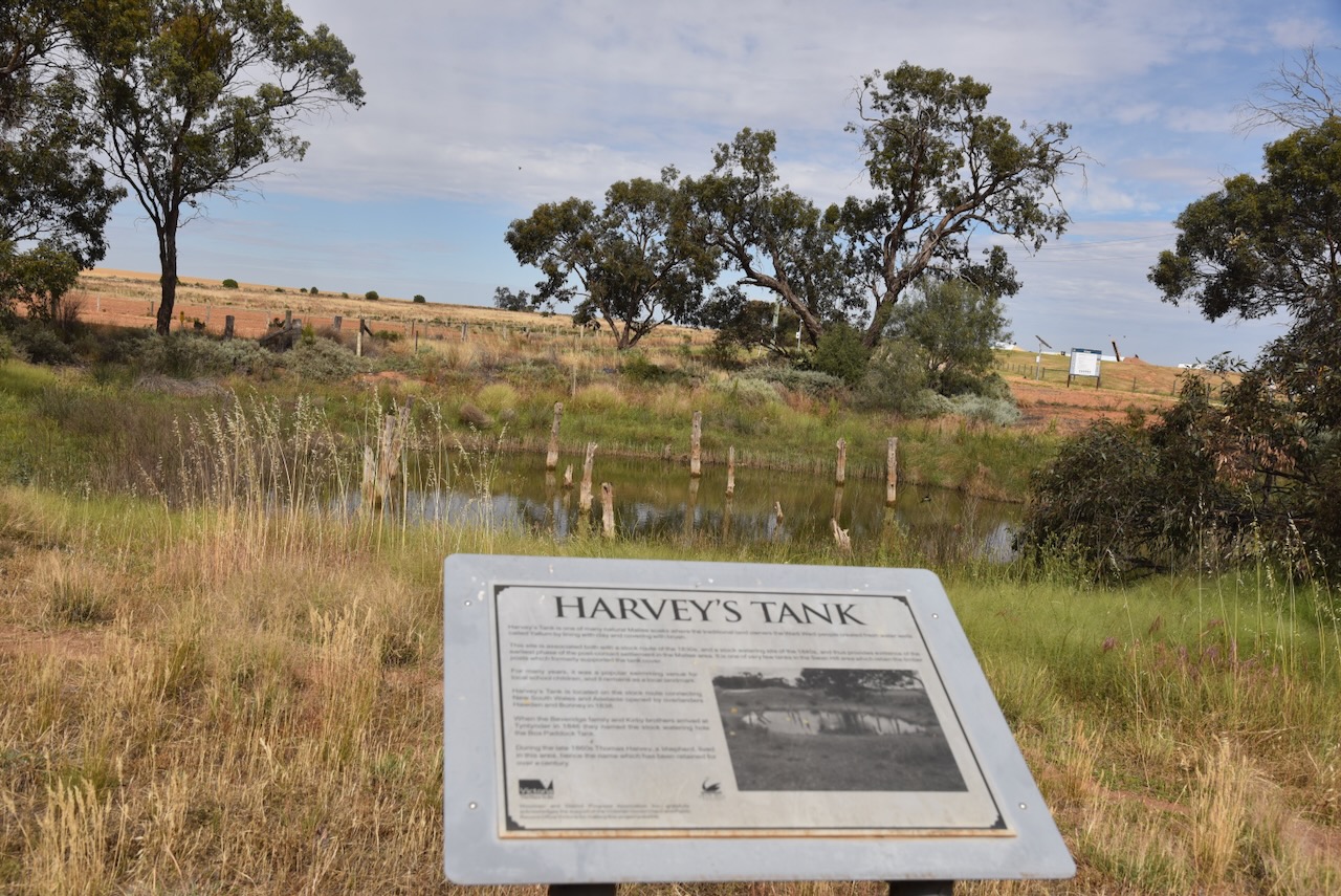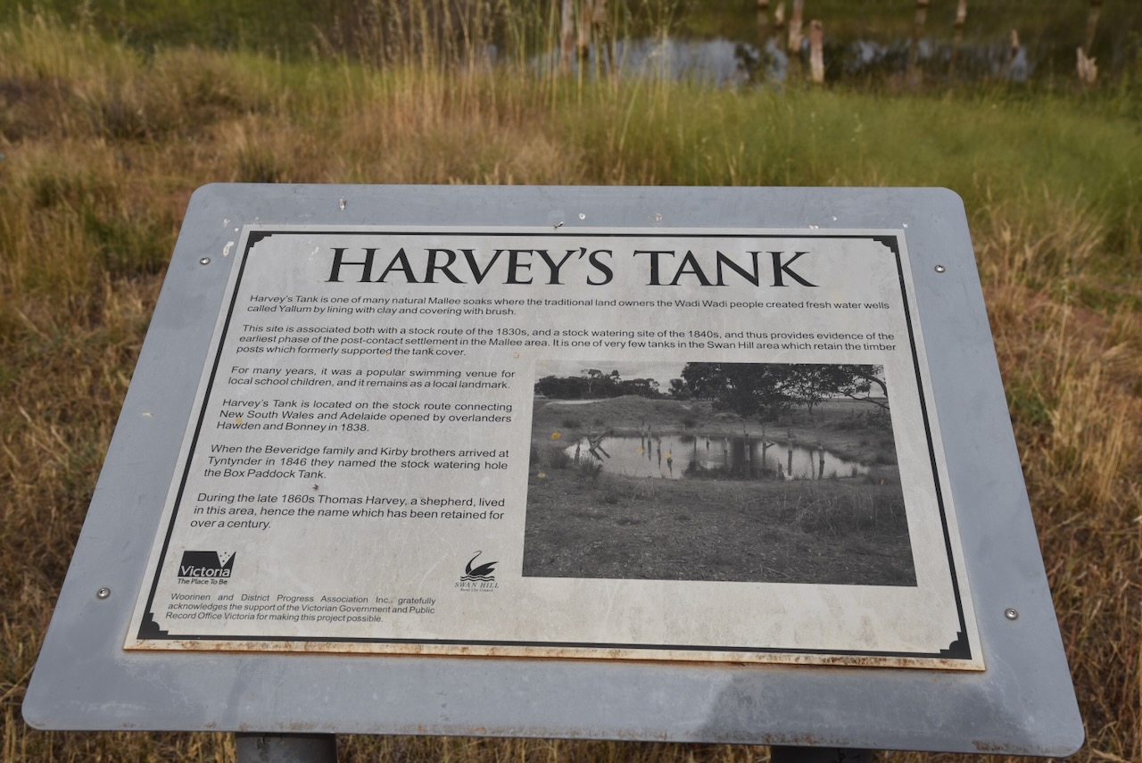 On the way, we stopped at Harvey’s Tank, which is named after Thomas Harvey, who was a shepherd who lived in the area in the 1860s. The tank is one of several natural Mallee soaks where the Wadi Wadi Aboriginal people created fresh water wells called Yallum by lining with clay and covering with brush. The tank is located on the stock route that connects New South Wales and Adelaide, South Australia and was opened by overlanders Hawden and Bonney in 1838. Harvey’s Tank was a popular swimming spot for local school children. It is one of the few tanks that retains the timber posts, which formerly supported the tank cover.