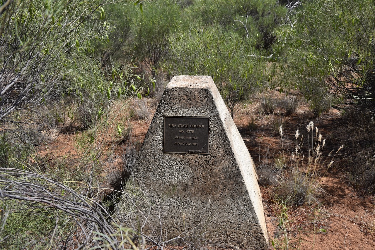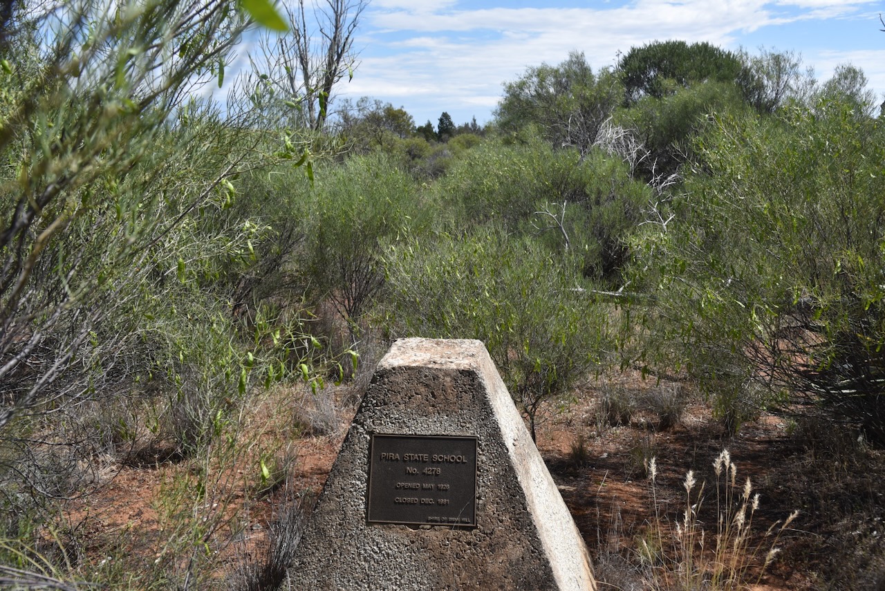 Nearby, you can view a monument for the Pira State School No. 4278, which opened in May 1926 and closed in December 1981.