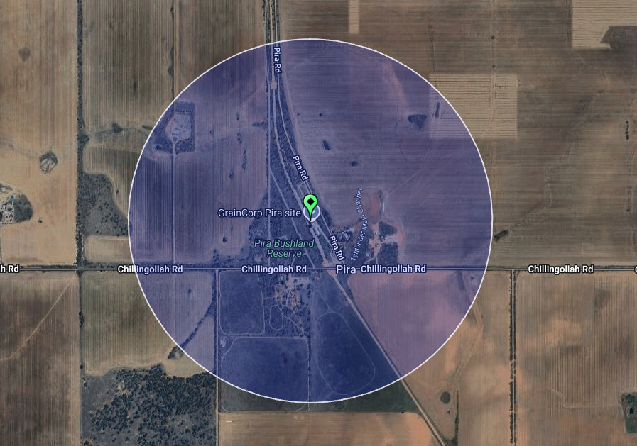 The Pira GrainCorp silos are located alongside the railway line on the western side of Pira Road and just north of Chillingollah Road. Some suggest that Chillingollah takes its name from the Indian word Chillianwallah, which was the name of a battle fought in India in 1840 between British and Sikh troops. Others say it is an Aboriginal word meaning waterhole. (Blake 1977)