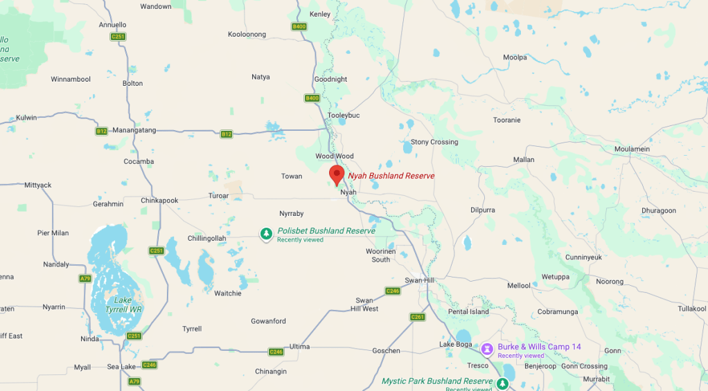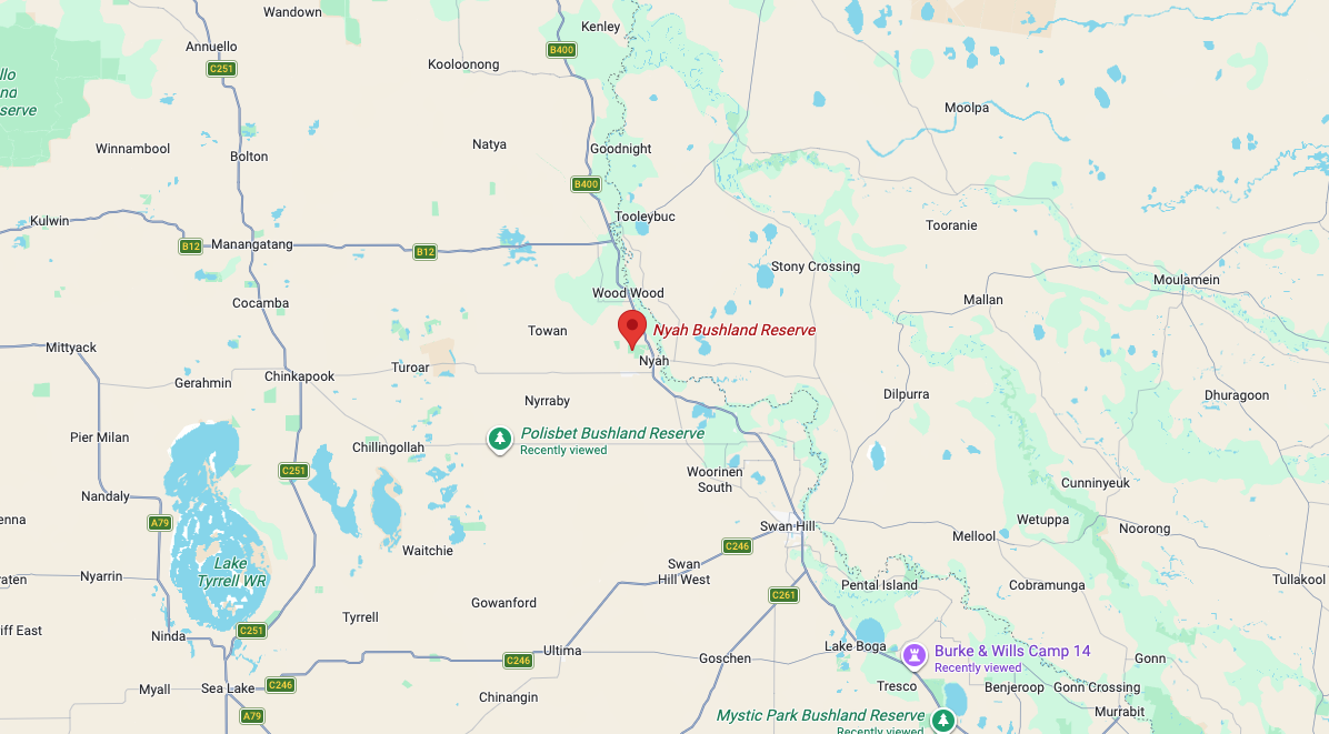 Above: Map showing the location of Nyah Bushland Reserve. Map c/o Google Maps