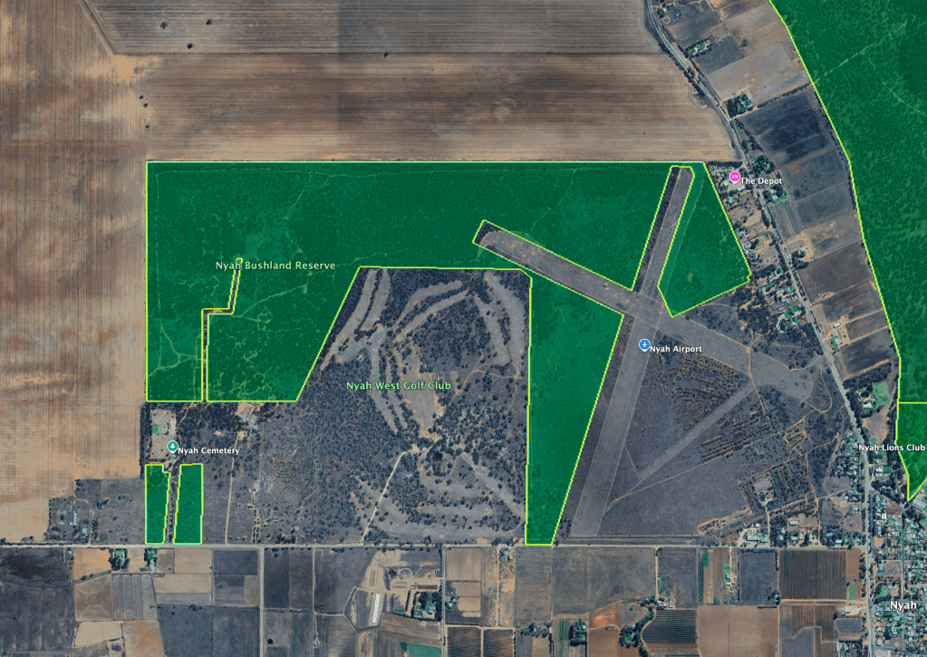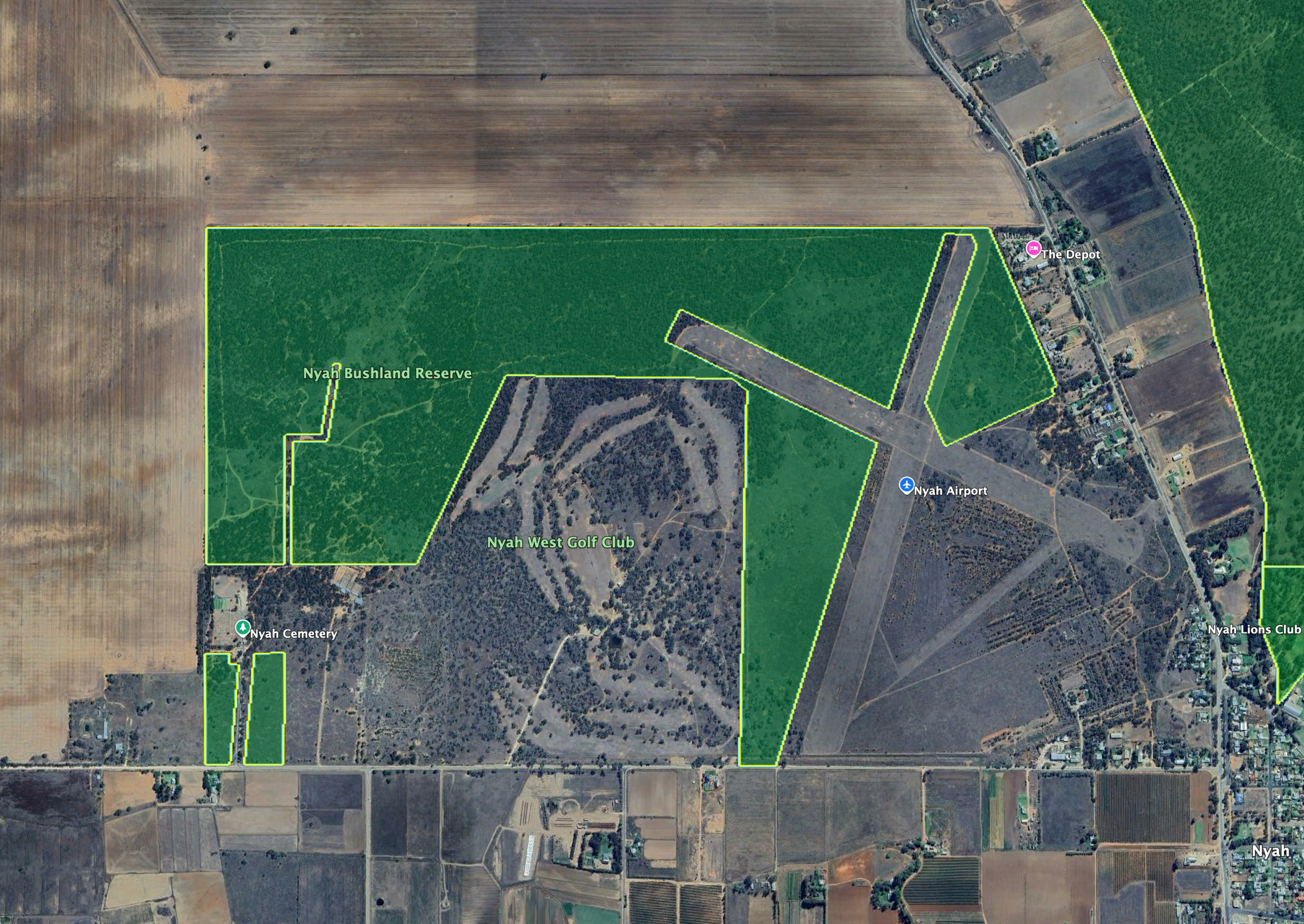 The Nyah Bushland Reserve is located on the northern side of Yarraby Road. It borders the Nyah West Golf Club and the Nyah Airport.