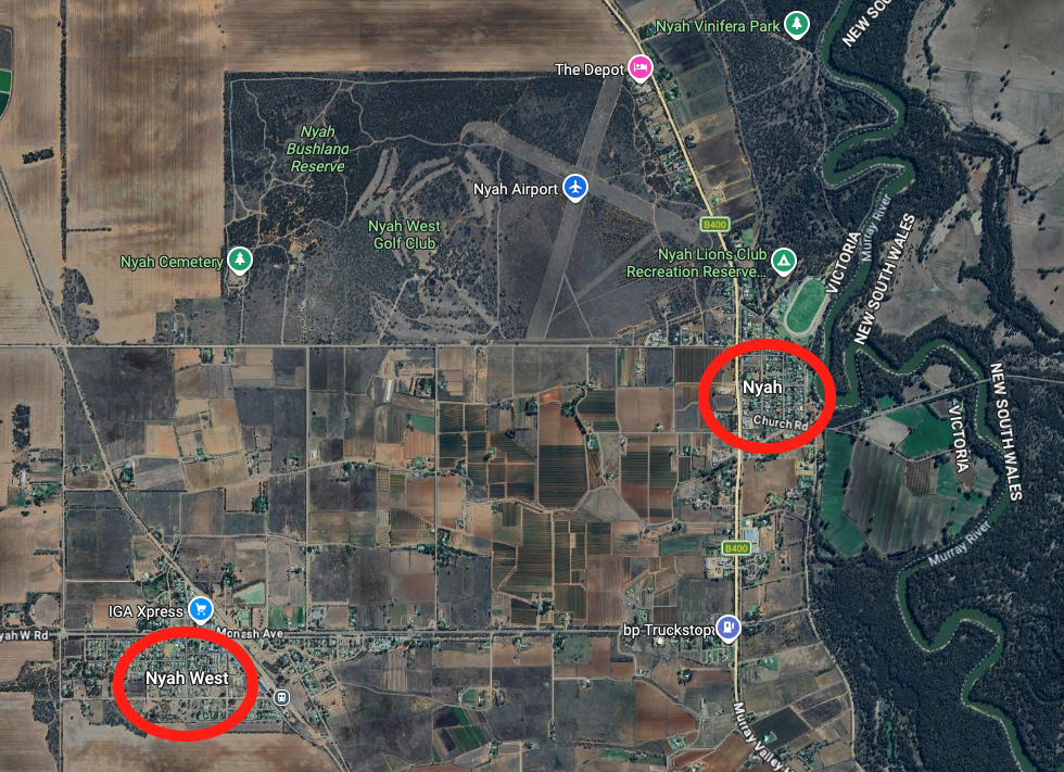 Above: An aerial view showing Nyah and Nyah West. Image c/o Google Maps